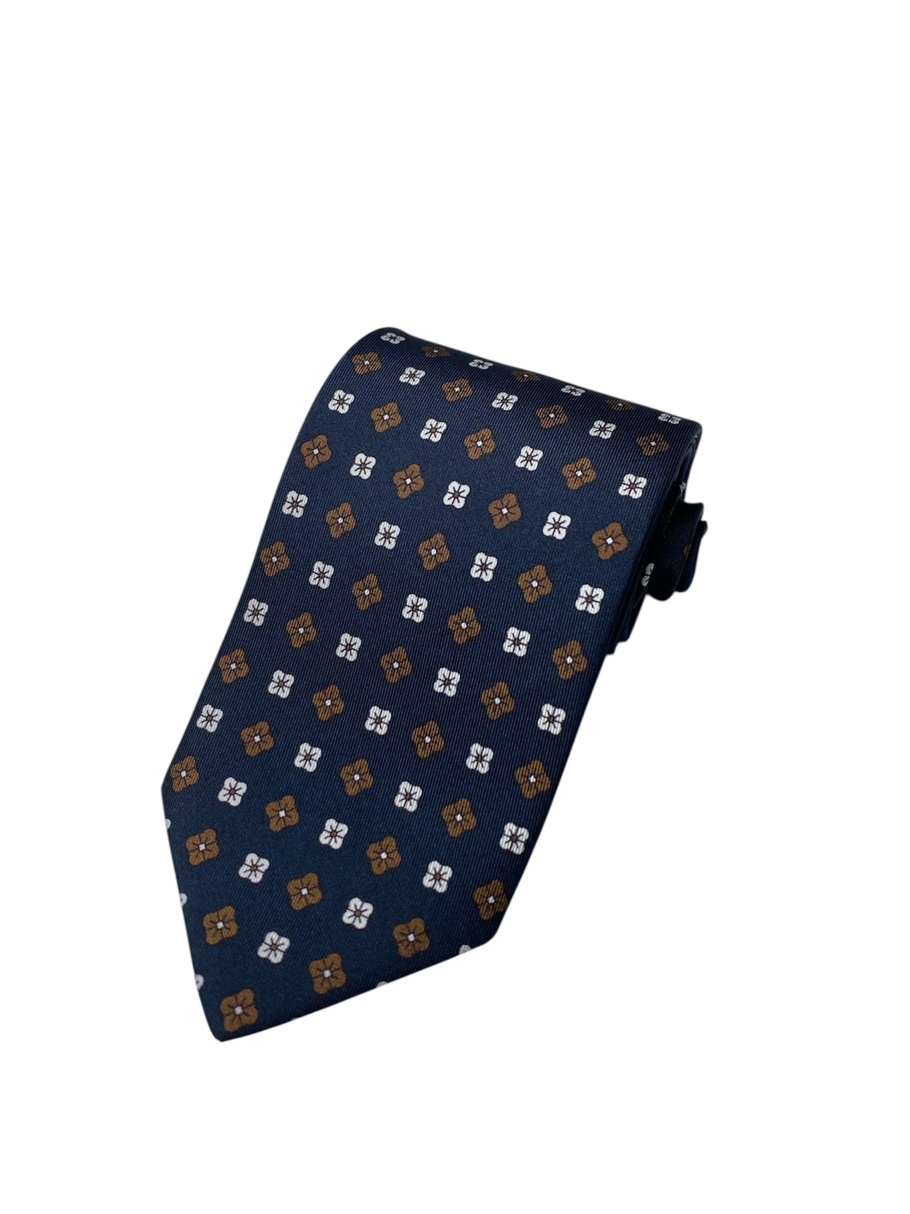 Against a deep navy blue background, the geometric floral pattern in warm tones of bronze and white adds a subtle touch of classicism and visual balance. It is a tie that impresses with its sobriety and harmony, perfect for the man who combines tradition with modernity.