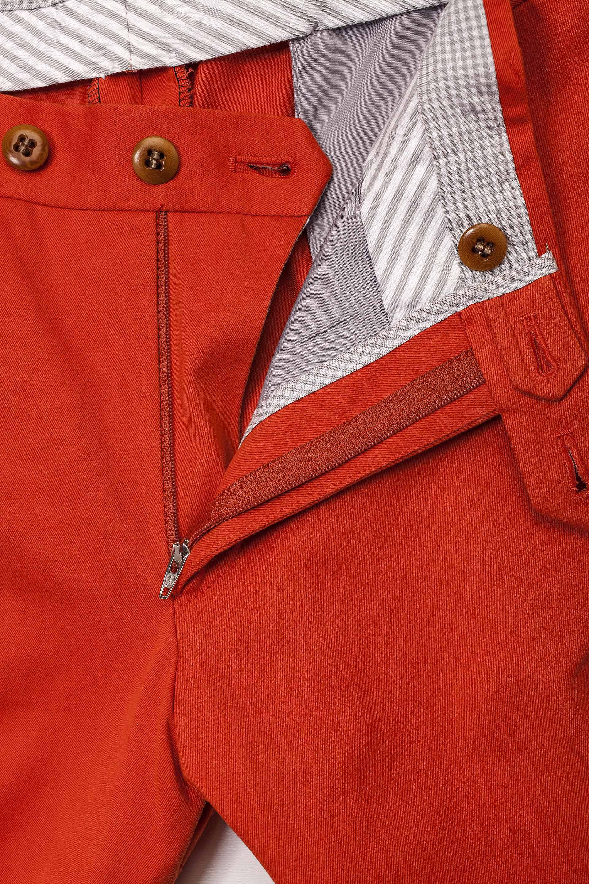 The chino trousers are made of twill fabric, 100% cotton.