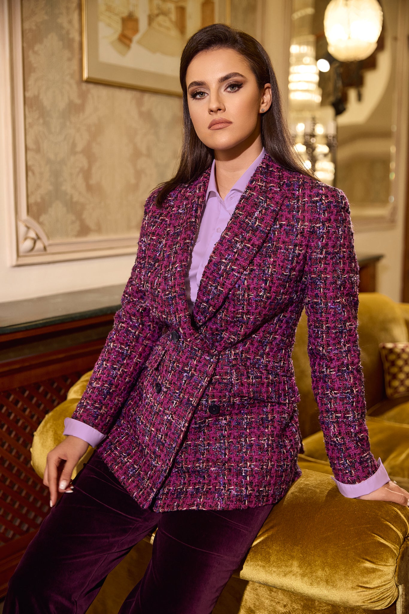 The dominant purple tones are complemented by contrasting accents, which gives this blazer remarkable versatility: it can be worn both in elegant contexts and in smart casual looks full of personality.
