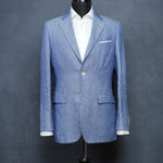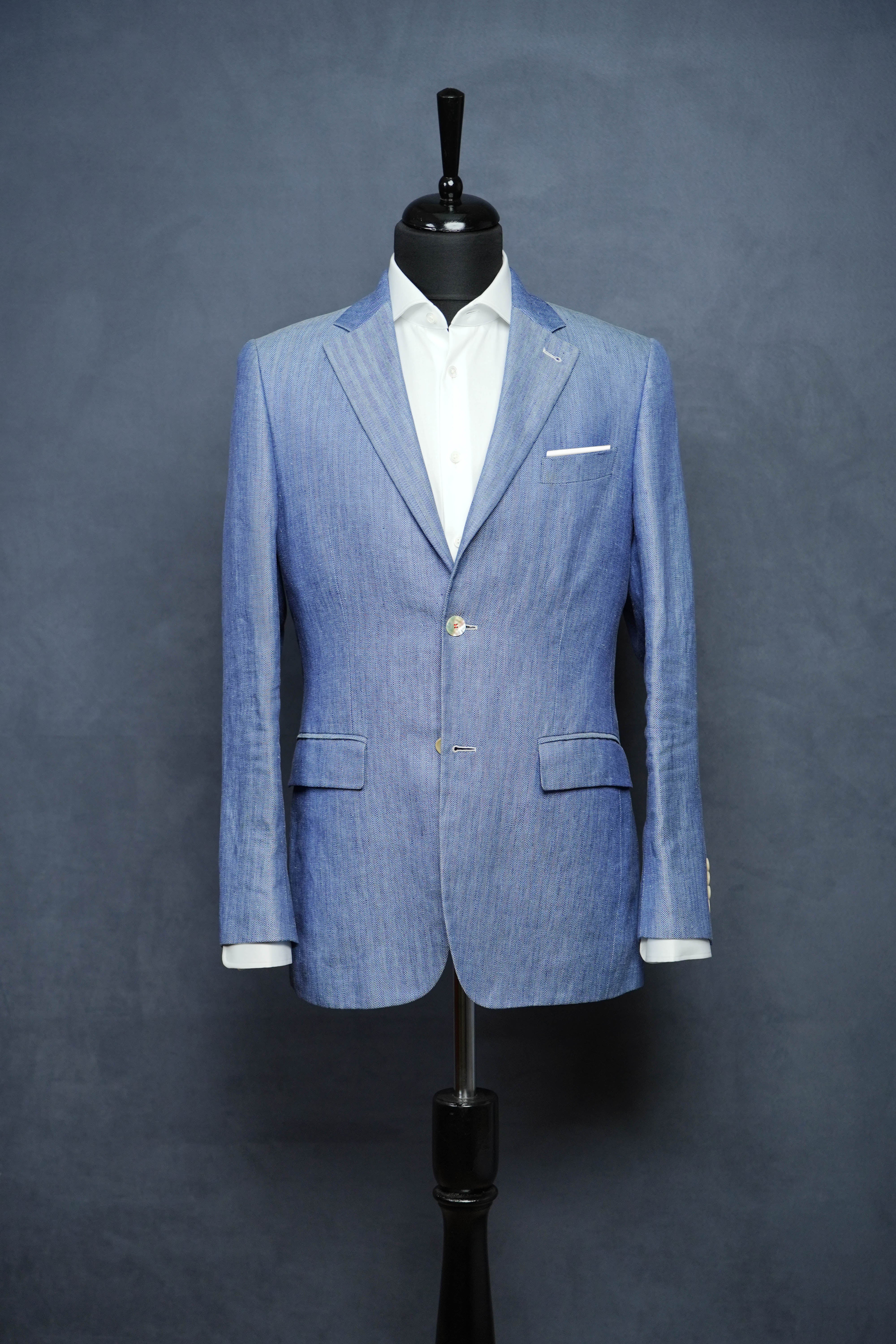 Luma is the definition of summer elegance — a blazer made from a premium linen and wool blend, sourced from the prestigious Holland & Sherry weaving mill, with a subtle herringbone pattern that catches the light in the finest shades of blue.