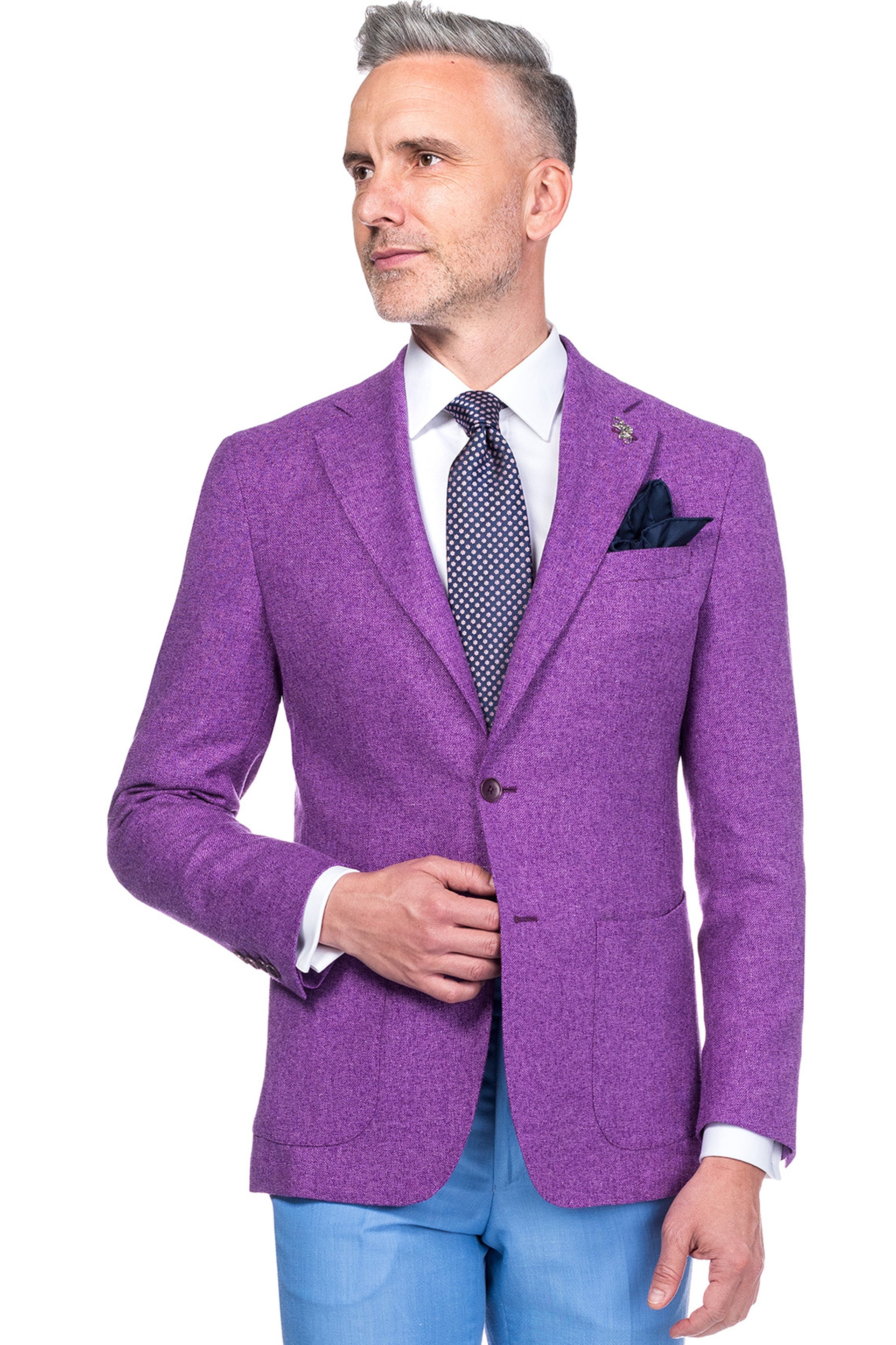 The Salton blazer, in a royal purple color, is a worthy choice for a stylish gentleman who wants to match bright colors, like that of the blazer, in his wardrobe.
