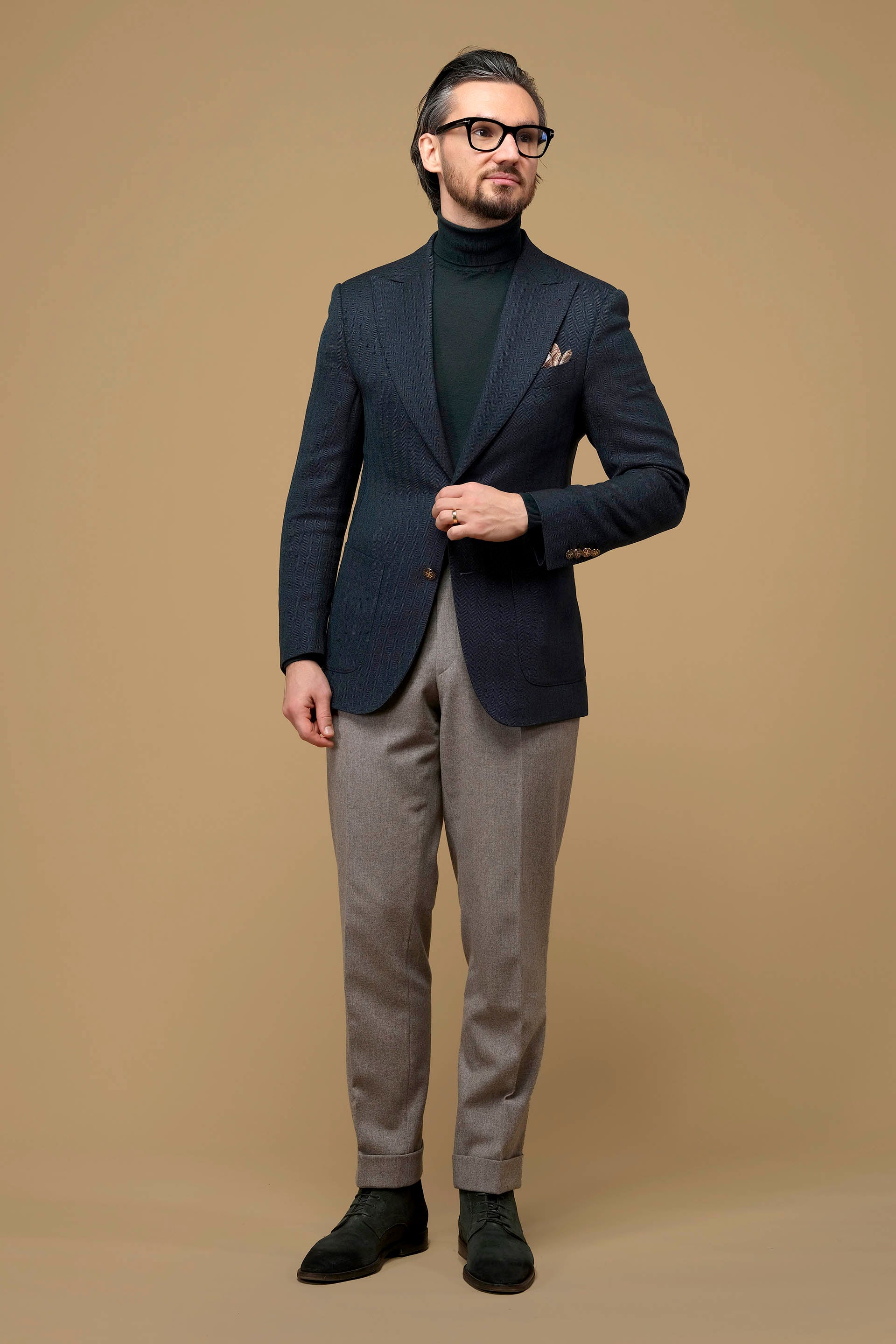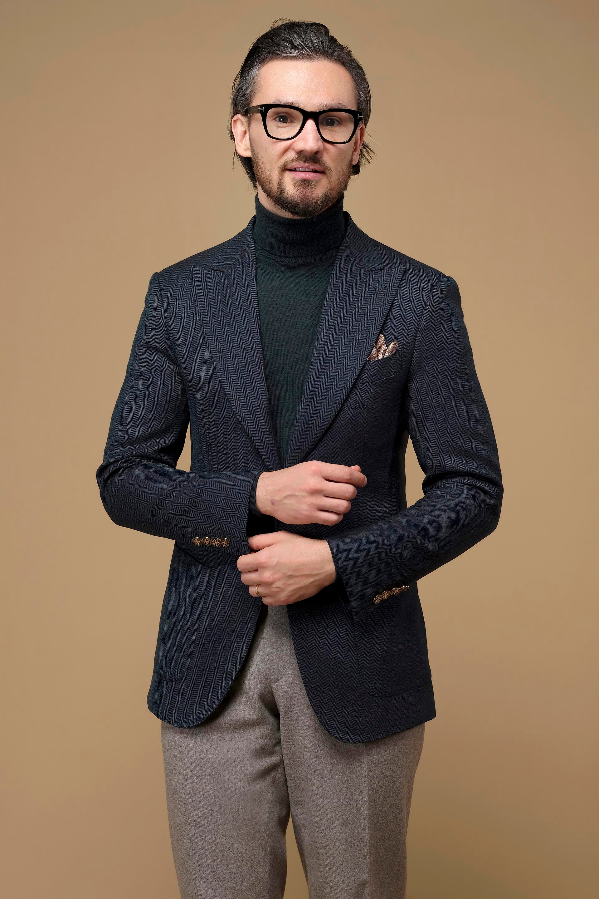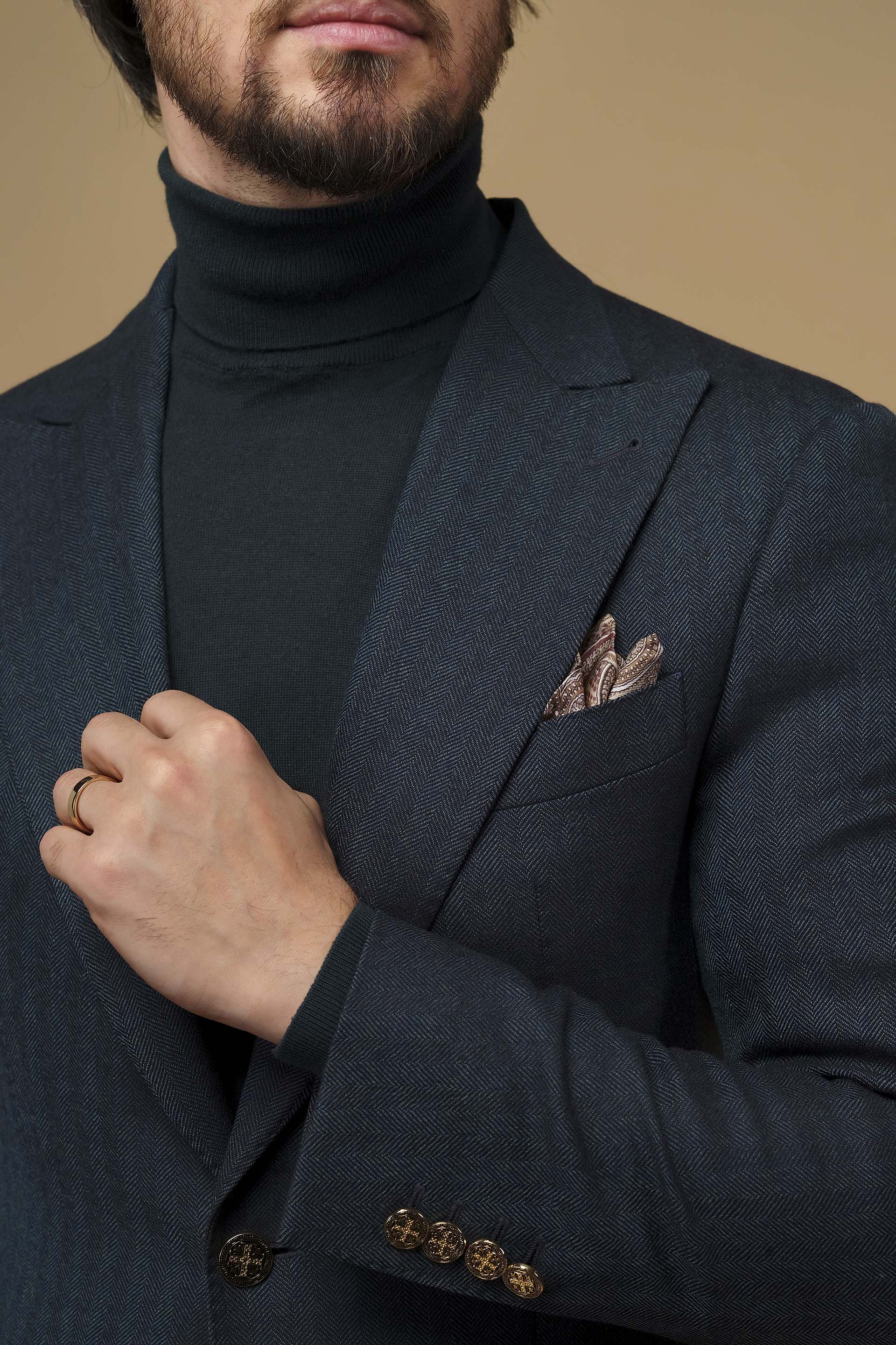 Un sacou de o culoare superbă verde pădure, cu pattern subtil și deosebit heringbone. Țesătura Scabal este emblematică pentru calitatea, durabilitatea și rafinamentul acestui sacou.