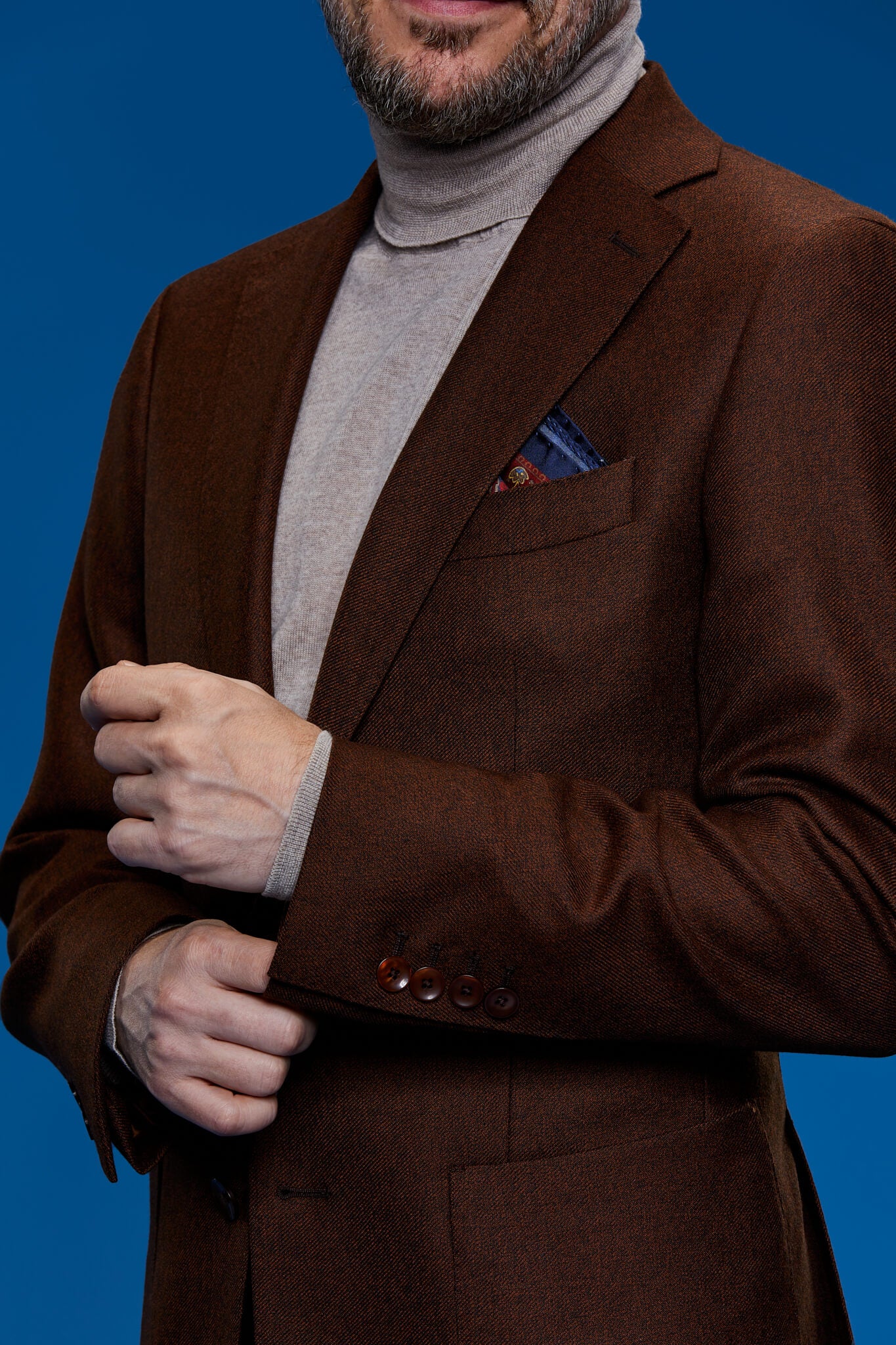 A suit in autumn tones, in a casual construction, with a soft and comfortable touch.