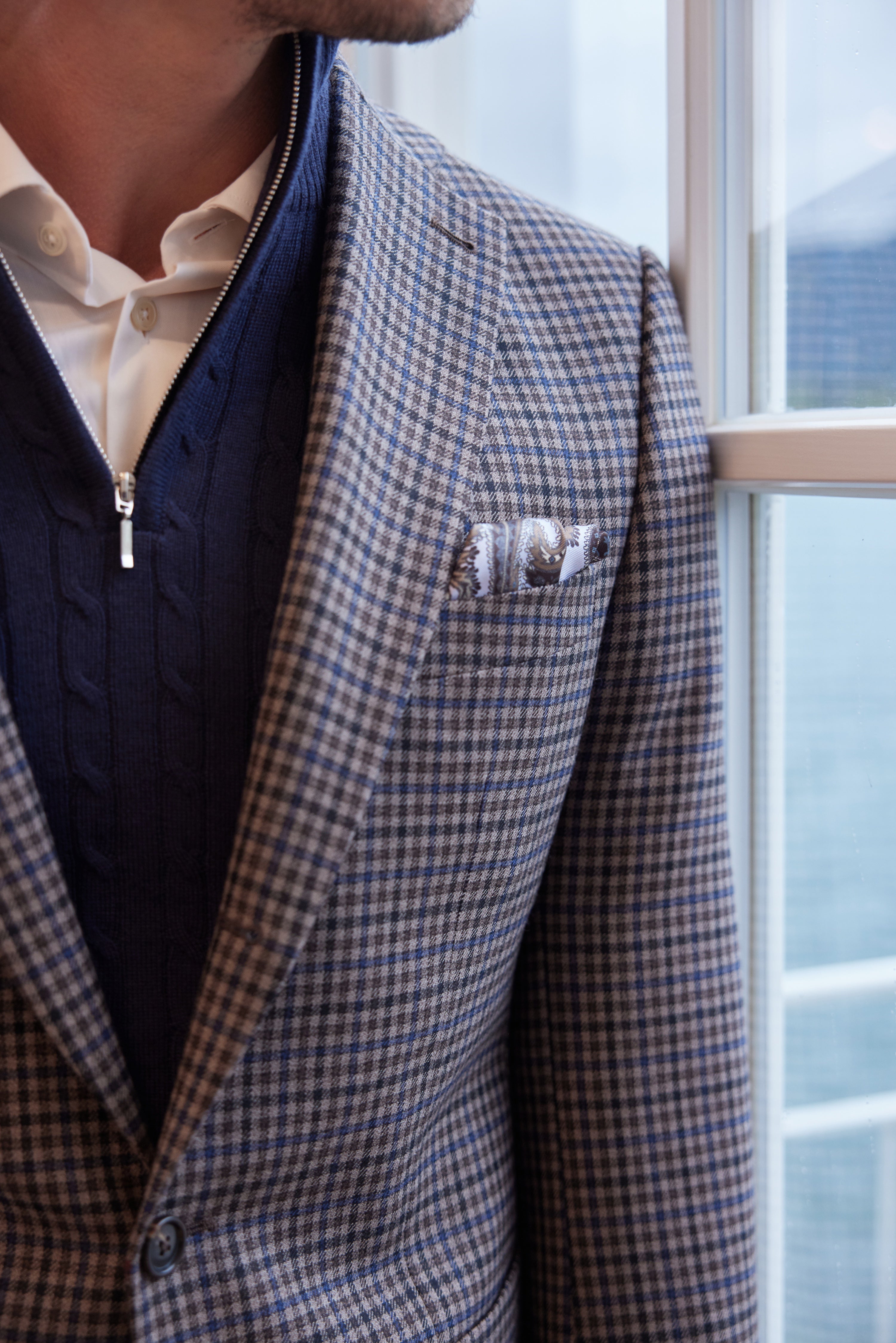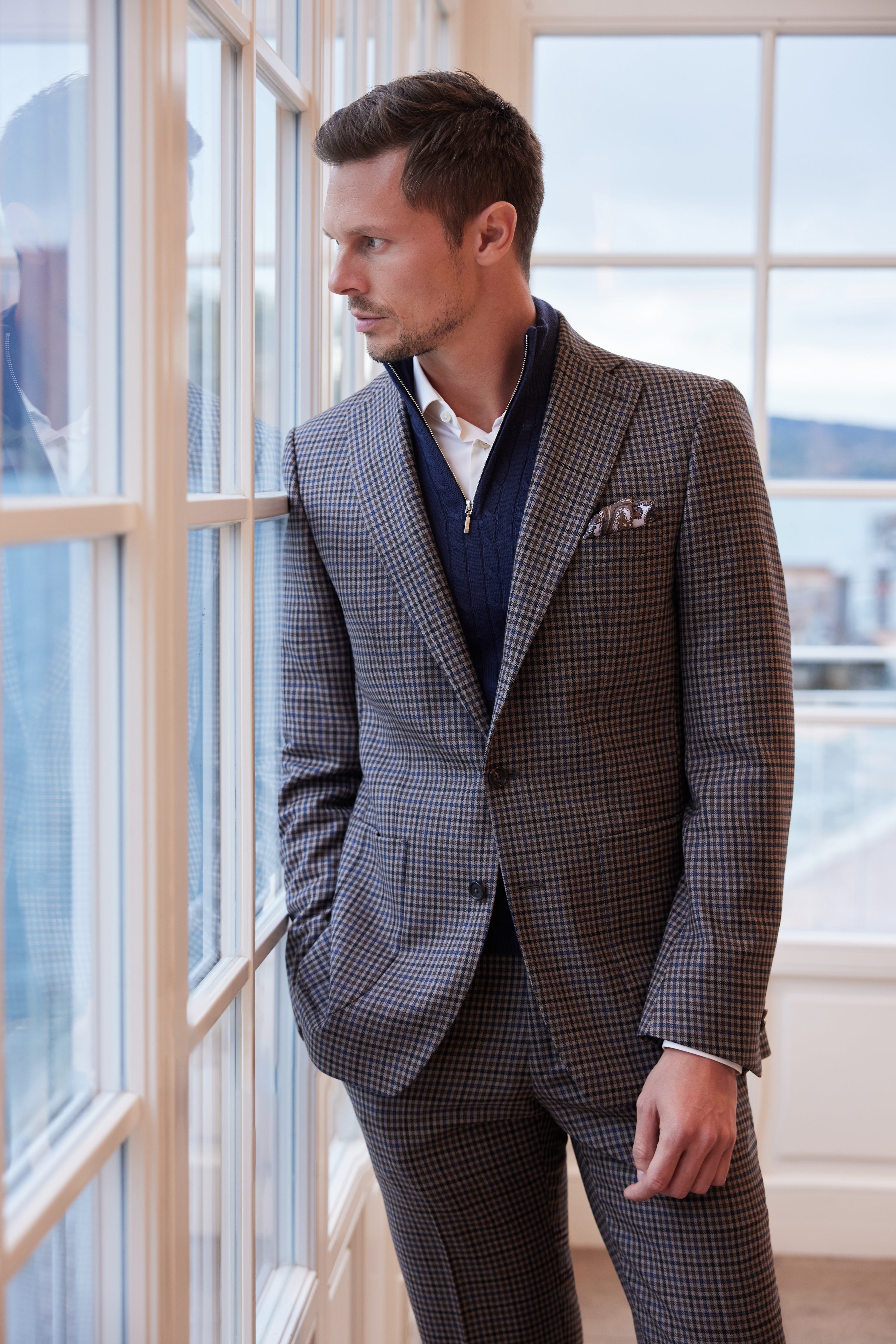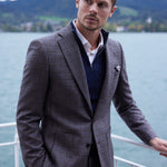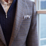 Der Dormeuil- Stoff – eine Neuauflage einer Sportkollektion von 1922 – bringt das Schneidererbe der klassischen Schneiderkunst in die Gegenwart. Dieser Anzug bringt den klassischen Charme der Wochenend-Outfits aus dem alten Europa mit sich.