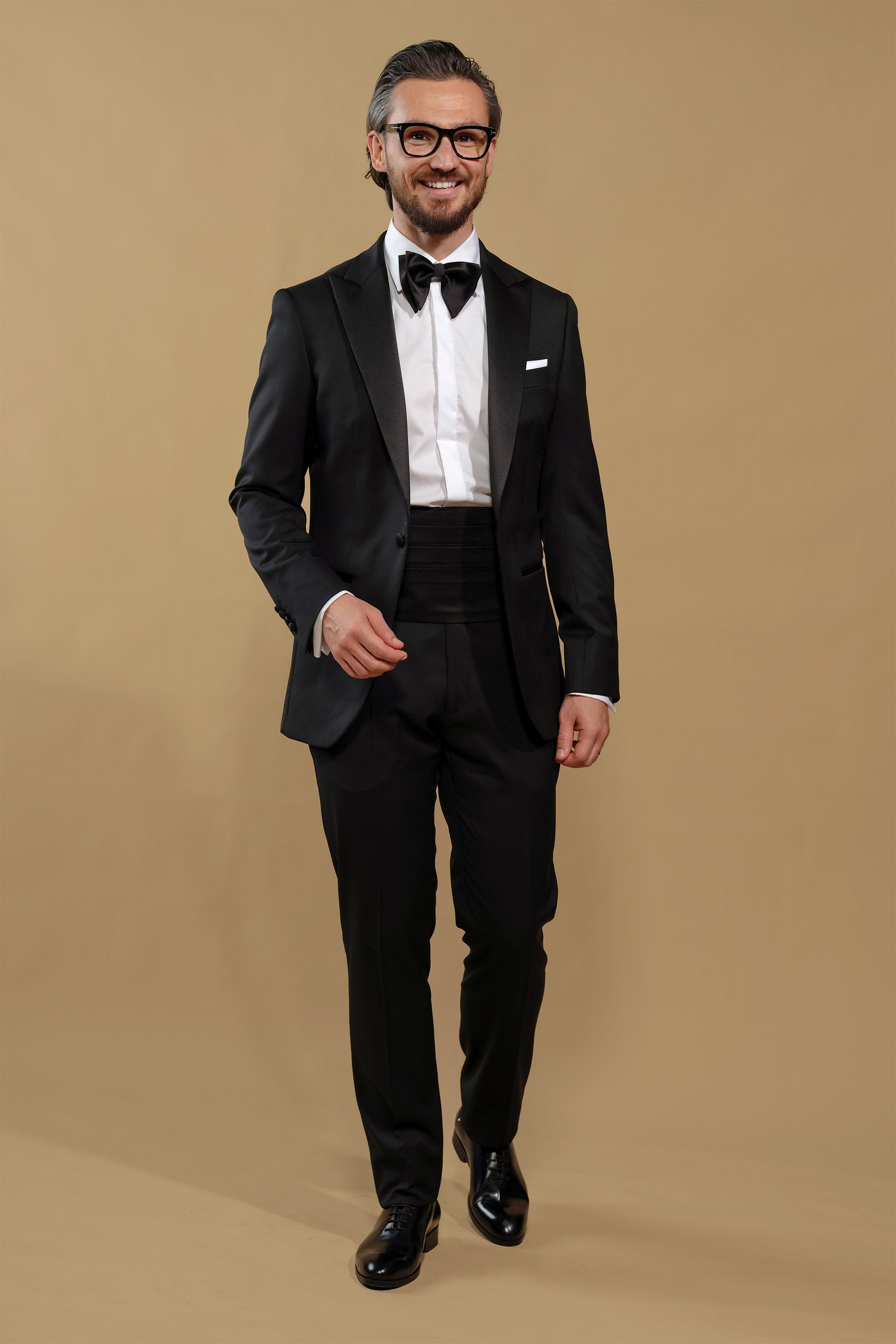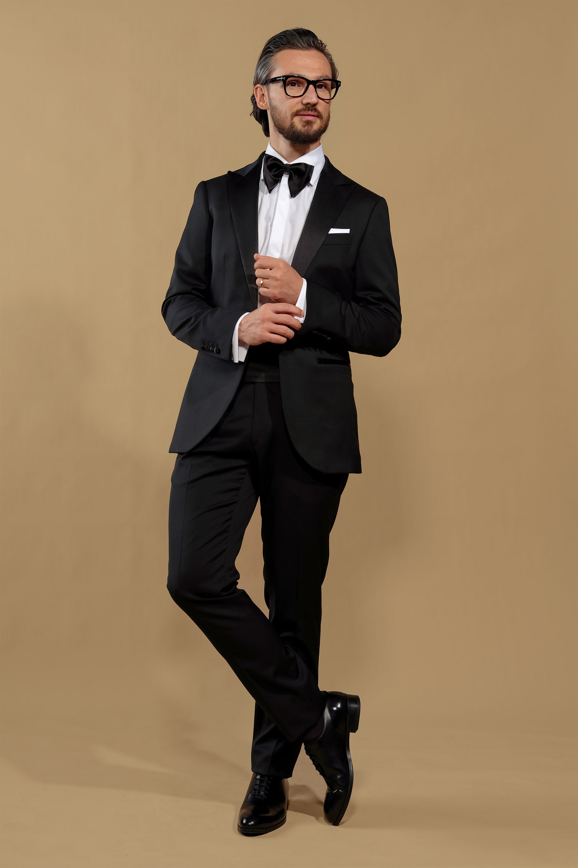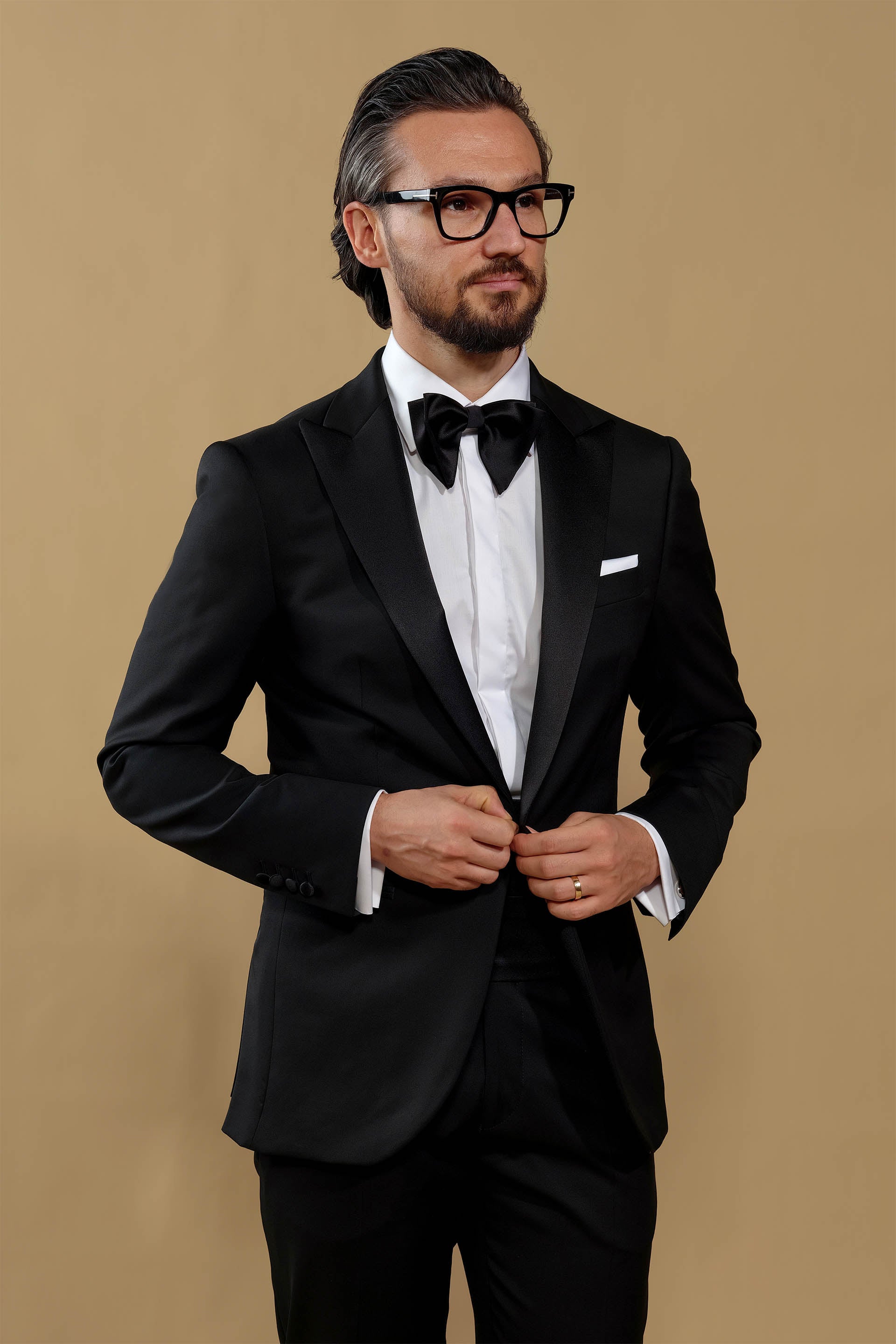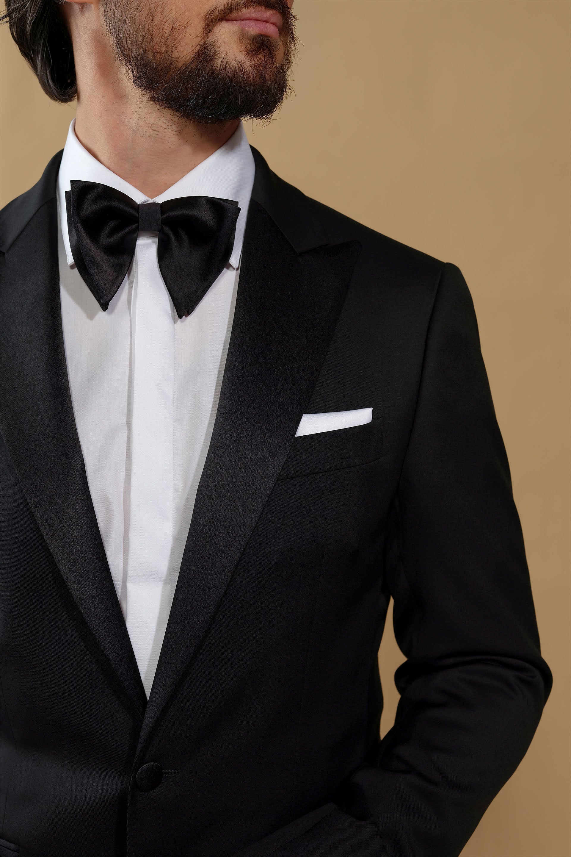 Sacoul cu revere elegante ascuțite, din satin, croiala impecabilă, și materialul premium de la țesătoria italiană Vitale Barberis - o țesătorie renumită în lume, care procesează lâna la cele mai înalte standarde de finețe, încă de la 1663 - evocă luxul atemporal, și celebrează esența momentelor speciale din viața ta.