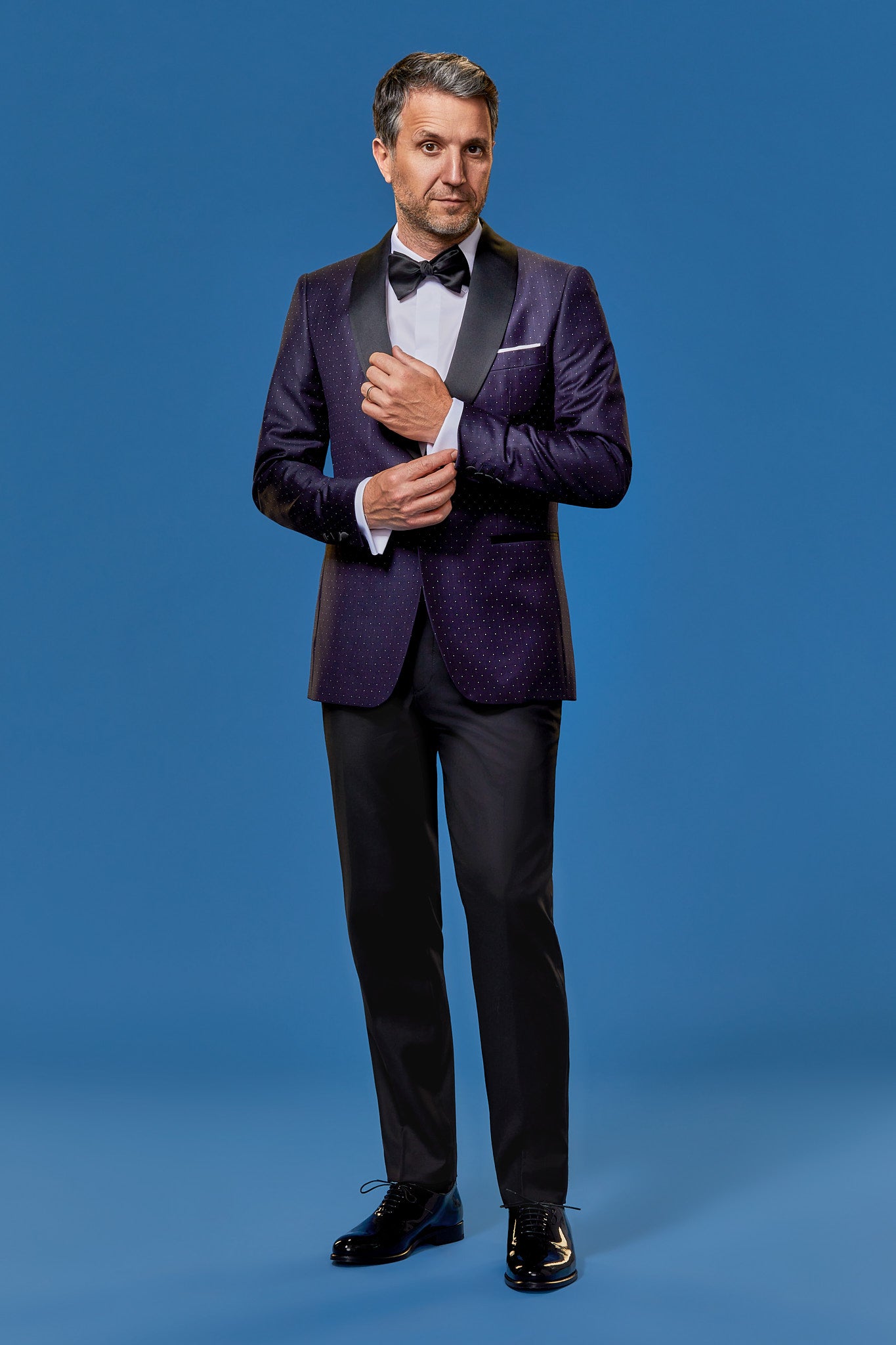 Ținuta de seară CARDINAL este pentru bărbații care îndrăznesc să aleagă o nuanță cu personalitate, și are ca piesă principală o jachetă de seară dintr-o țesătură bleumarin cu puncte discrete.