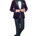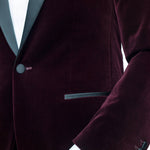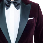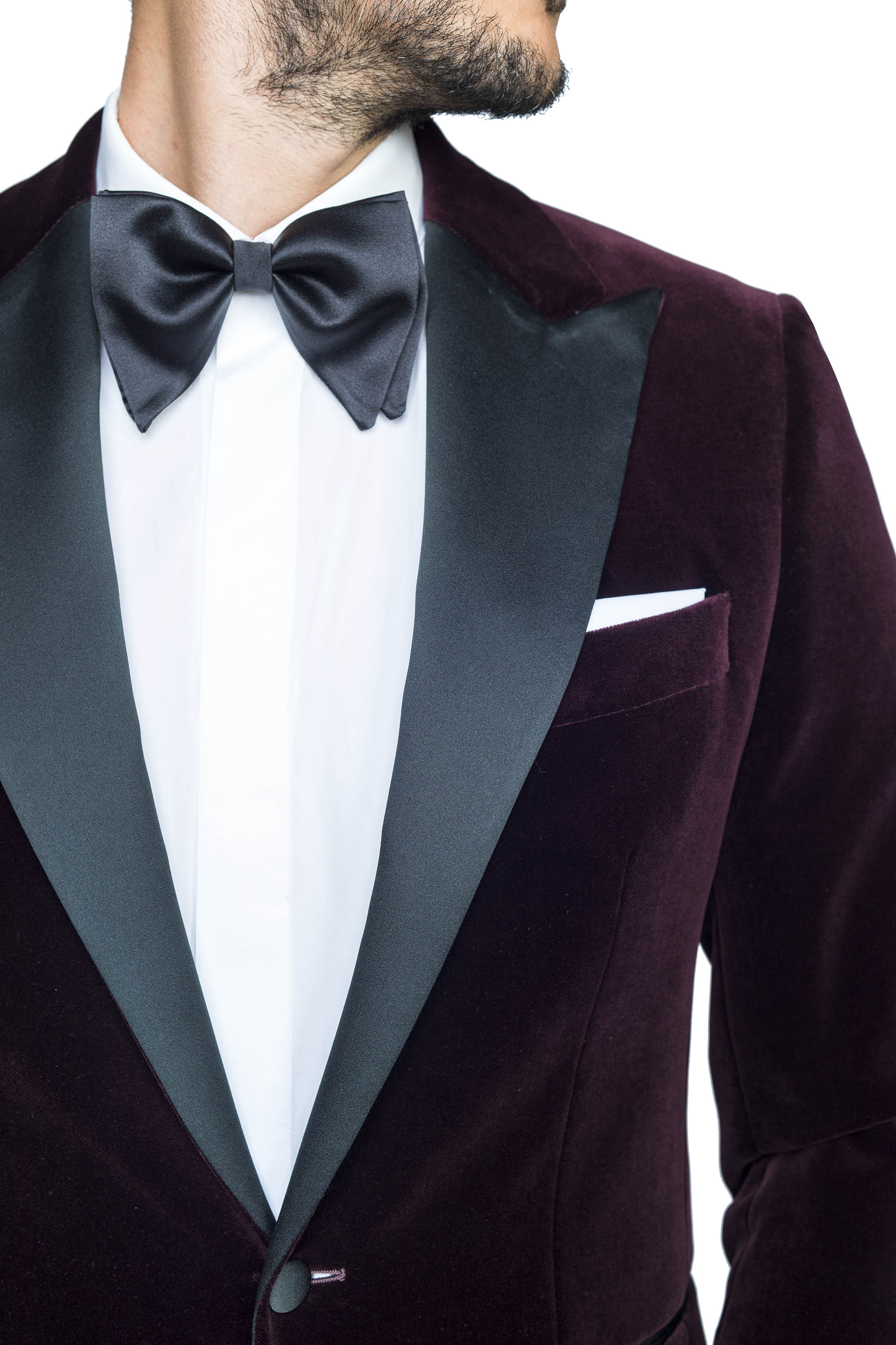 O ținută de excepție, pornind de la culoarea vișinie a catifelei, reverul și detaliile din mătase neagră, care evidențiază nonșalanța unui smoking veritabil.
