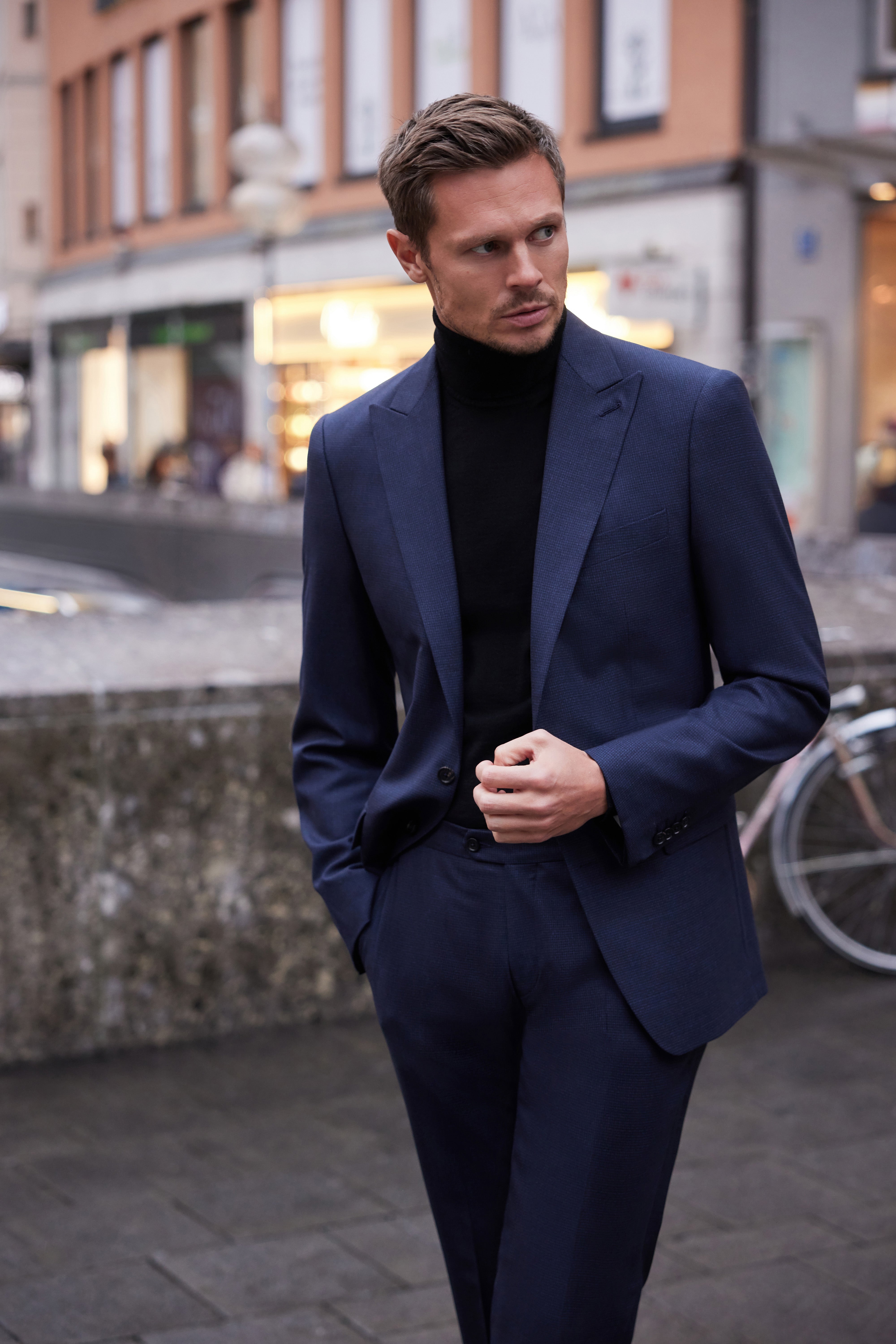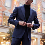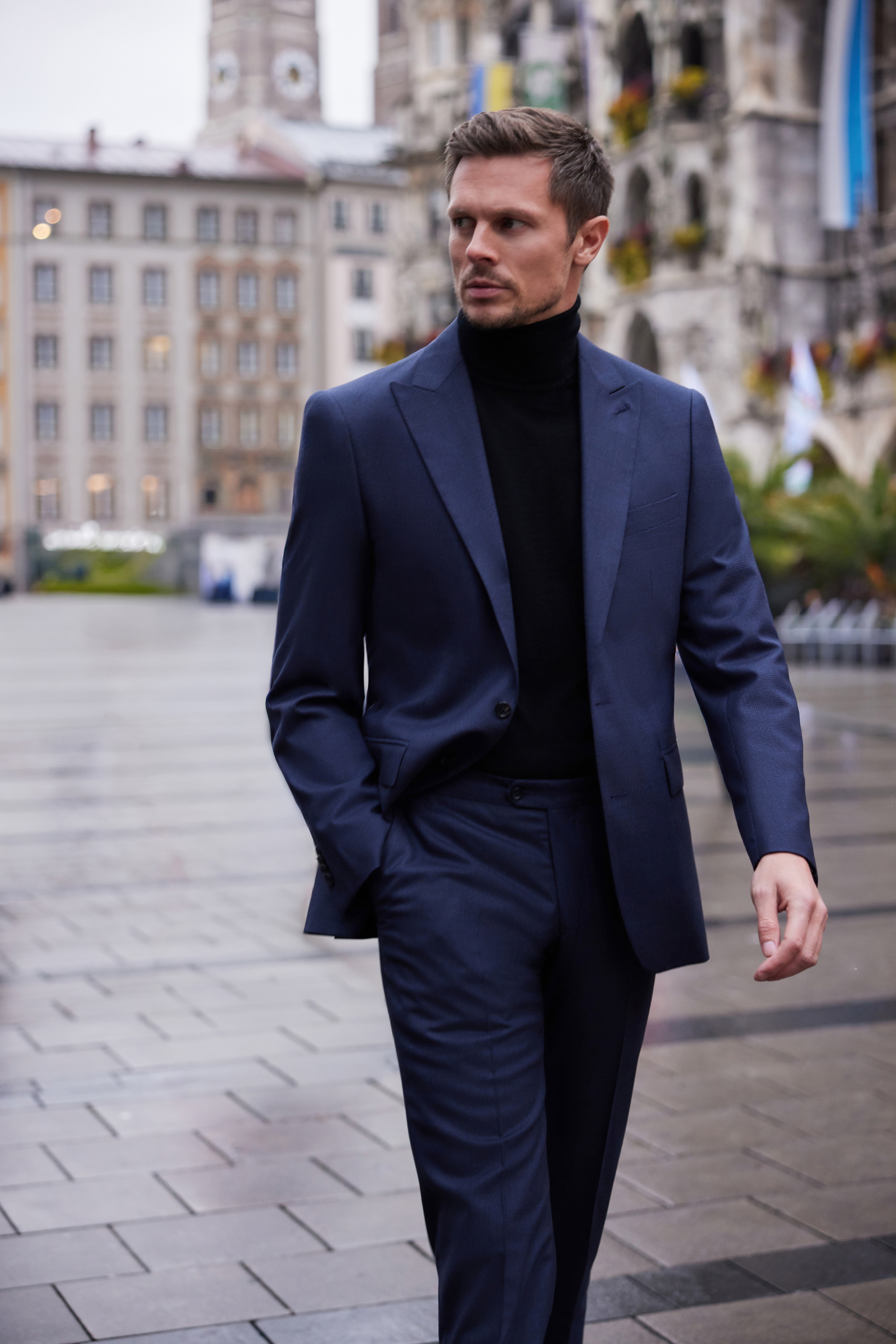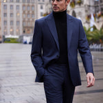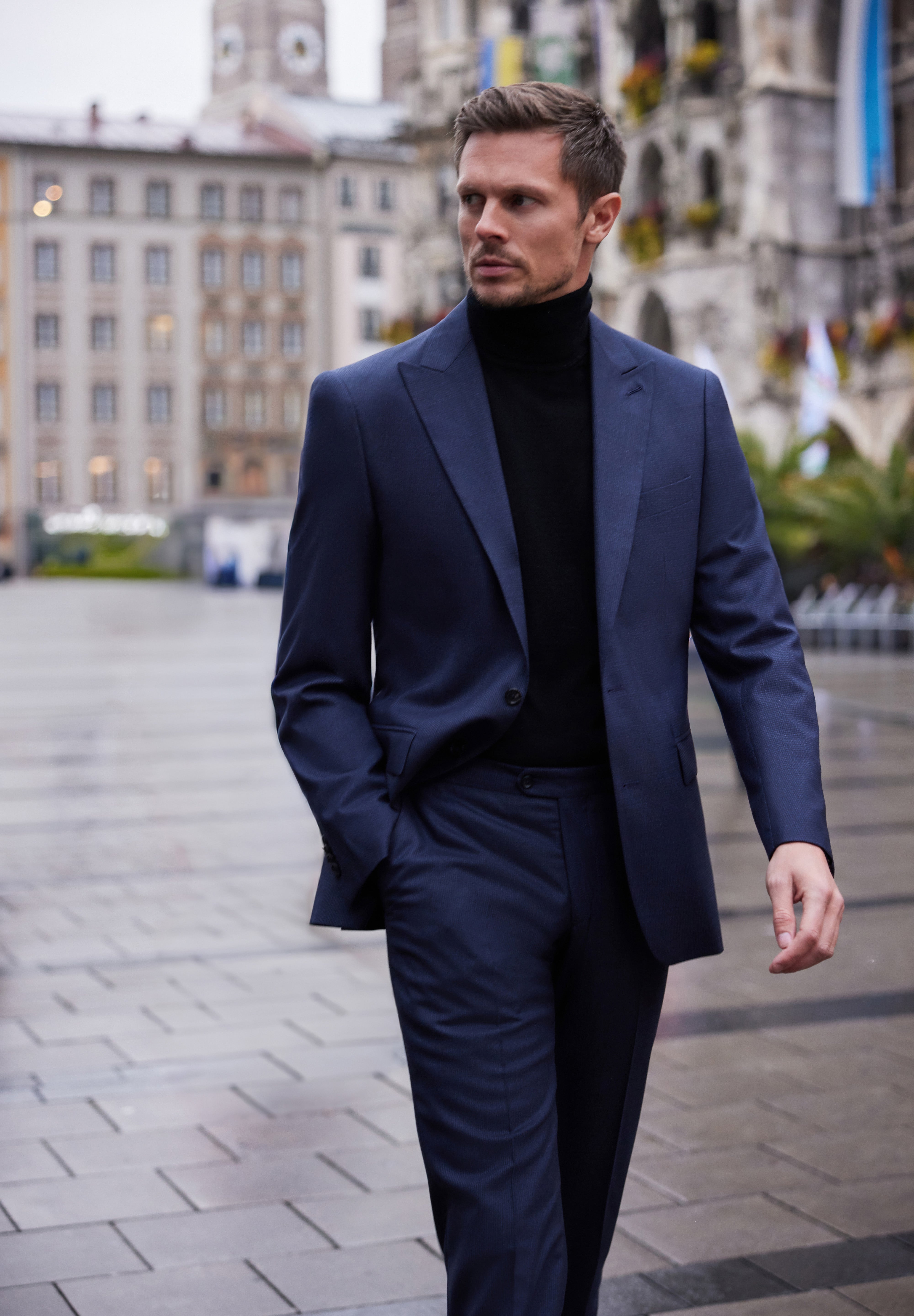 Confecționat dintr-o țesătură de lână fină, semnată de renumita casă Ermenegildo Zegna, acest costum este expresia supremă a simplității sofisticate. Nuanța sa adâncă de albastru marin evocă calmul nopților italiene, iar textura discretă, aproape fluidă, vorbește despre echilibru și forță interioară.