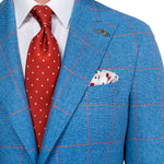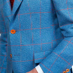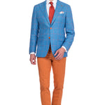 Țesătura sacoului este foarte ușoară și respirabilă datorită combinației de in, mătase și lână. Pantalonii portocalii complimentează caroiajul sacoului.