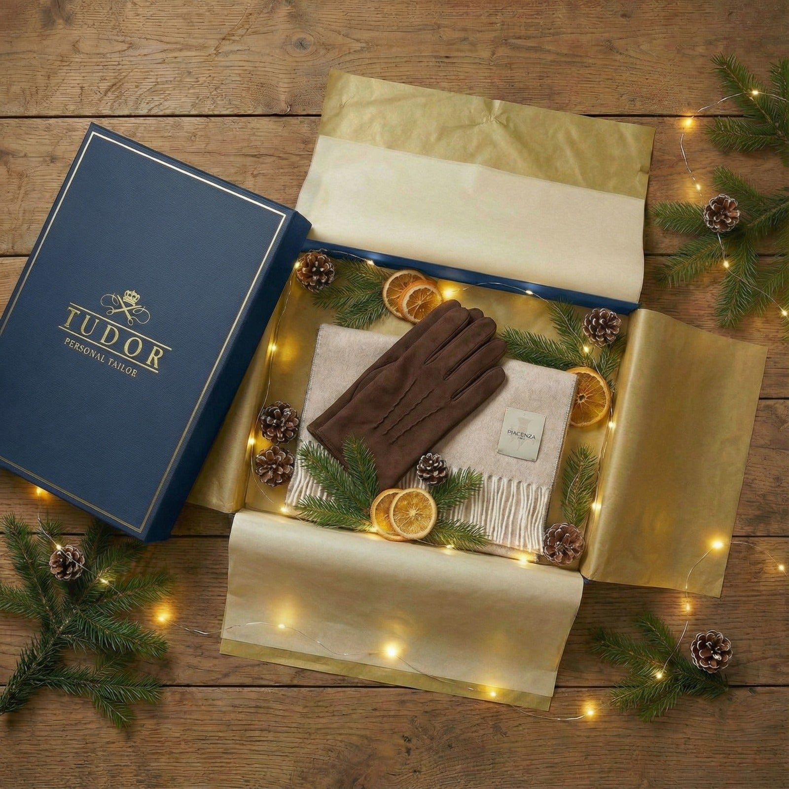 Aceasta este una dintre ele, și include un fular țesut dintr-un amestec nobil de cașmir și mătase de la renumita casă Piacenzași o pereche de mănuși din piele de capră, moale și durabilă, căptușite cu un cașmir fin și călduros.