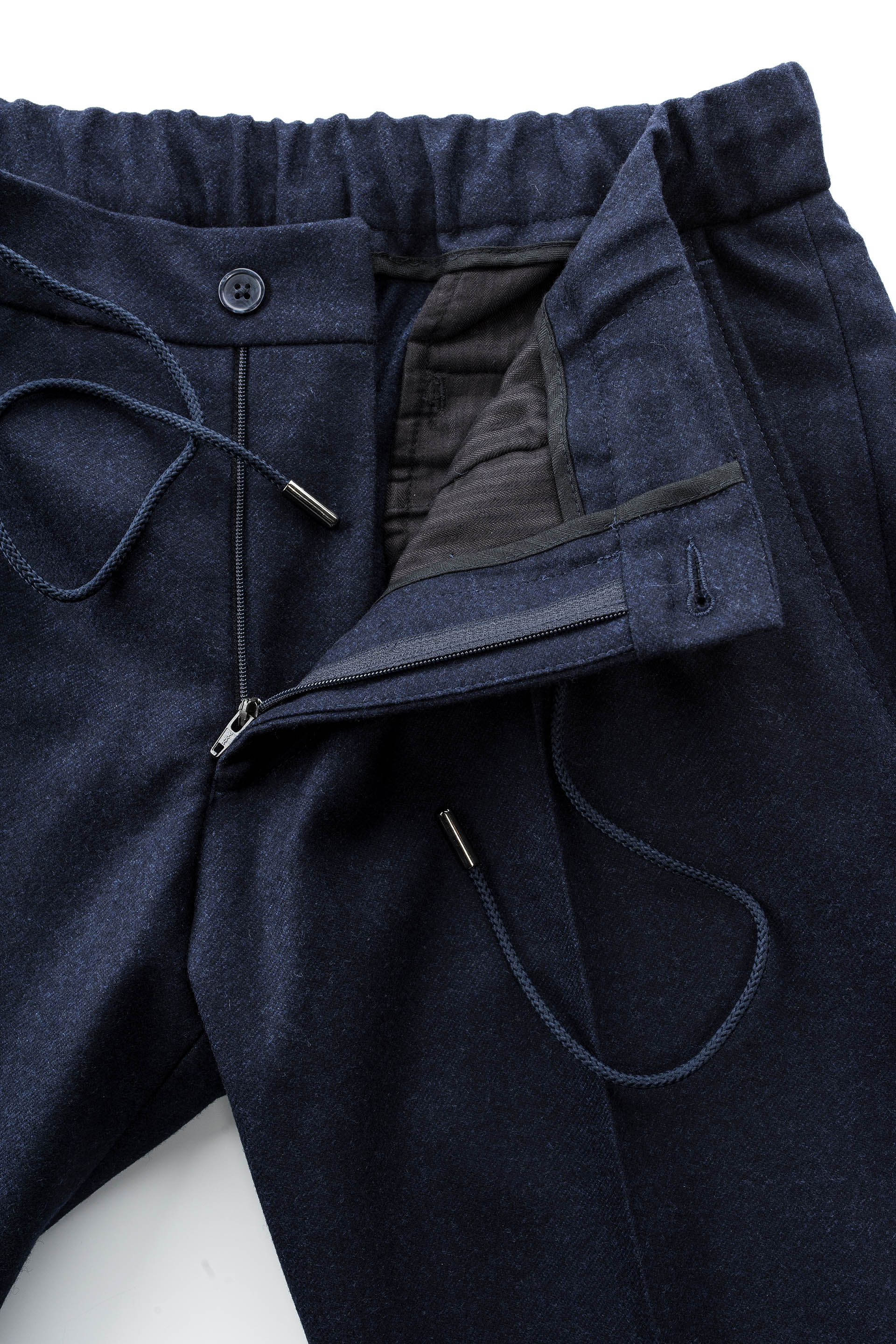 O reinterpretare a pantalonului clasic de costum, avand betelia realizata din banda de elastic cu snur pentru un confort sporit.