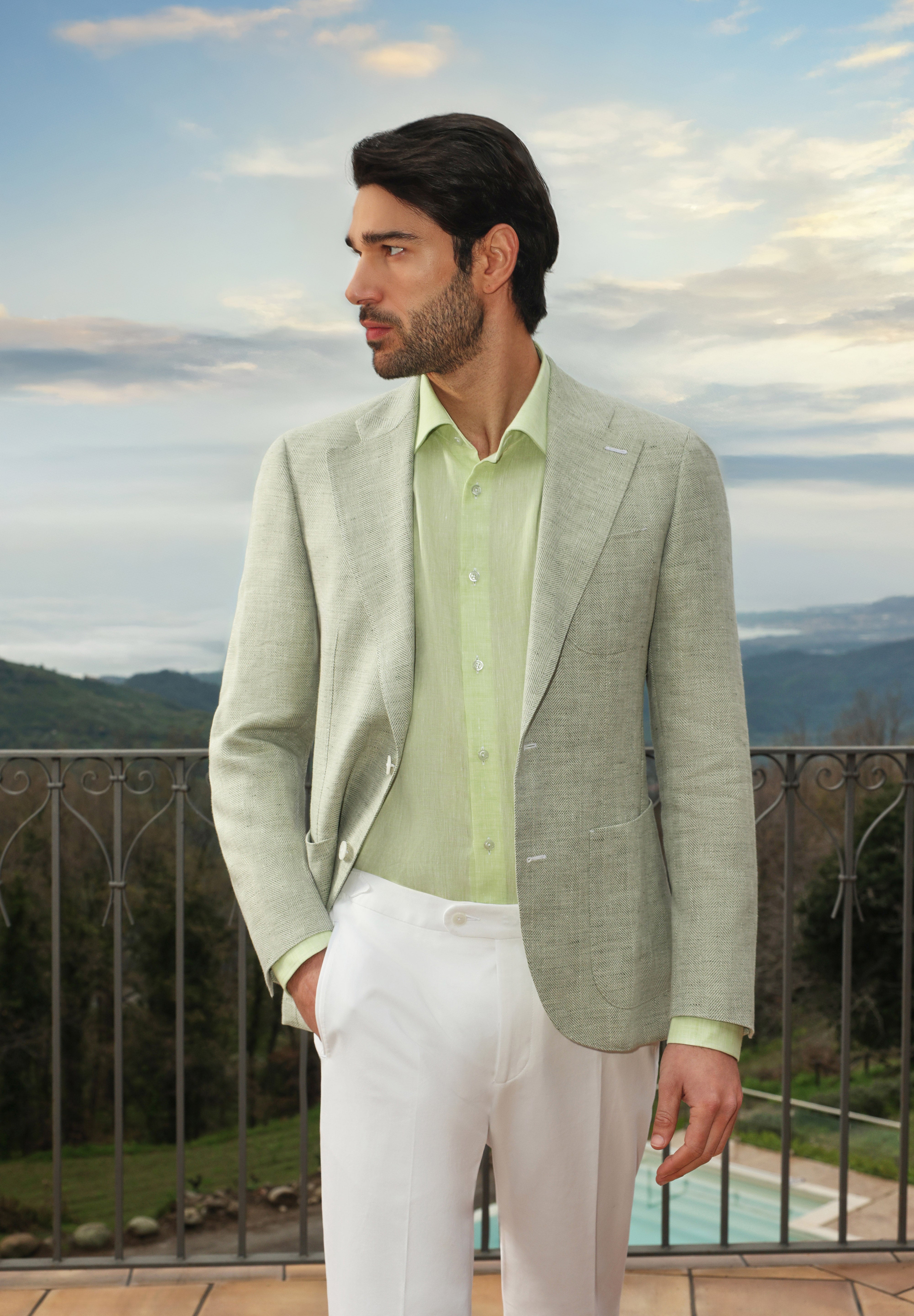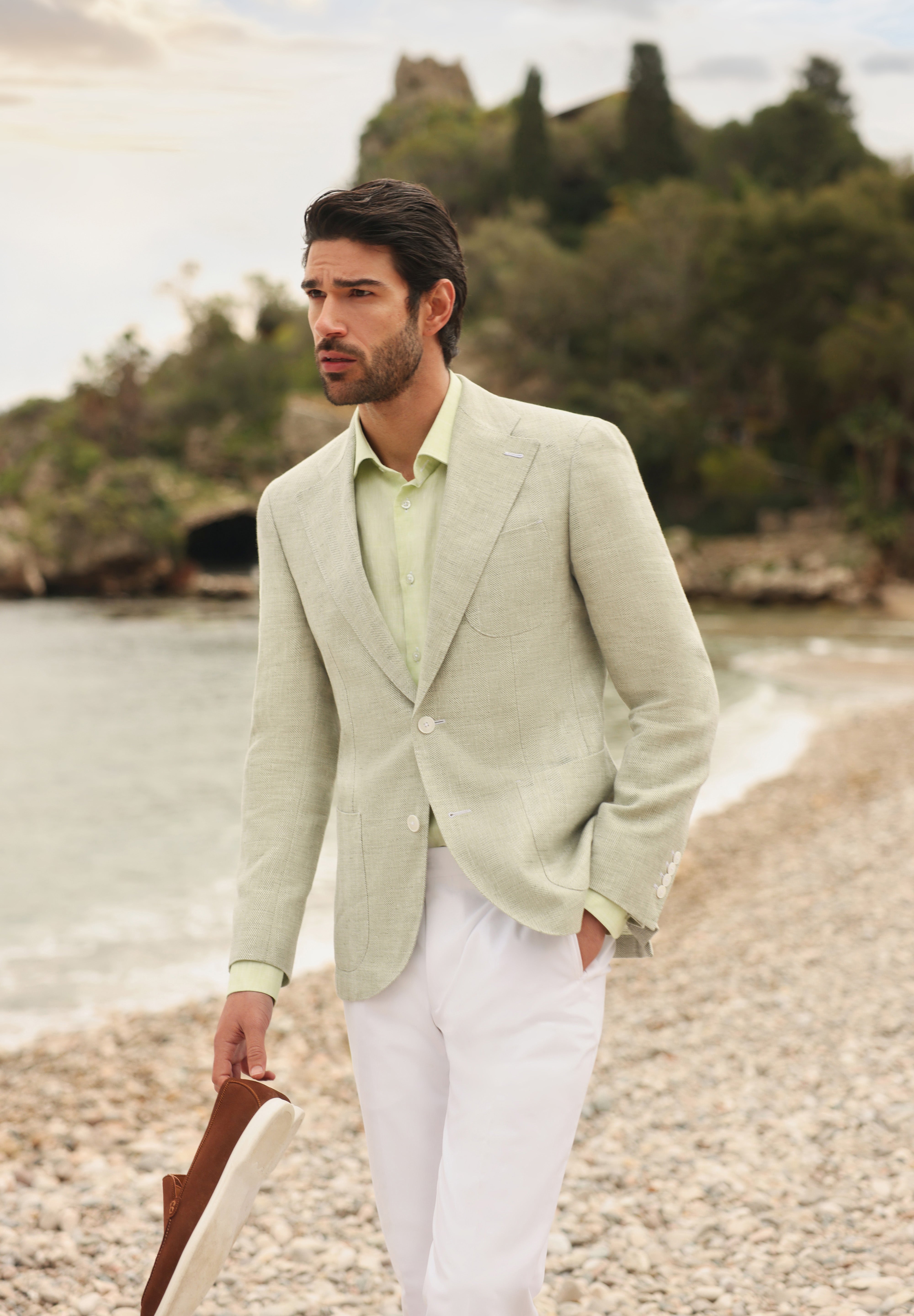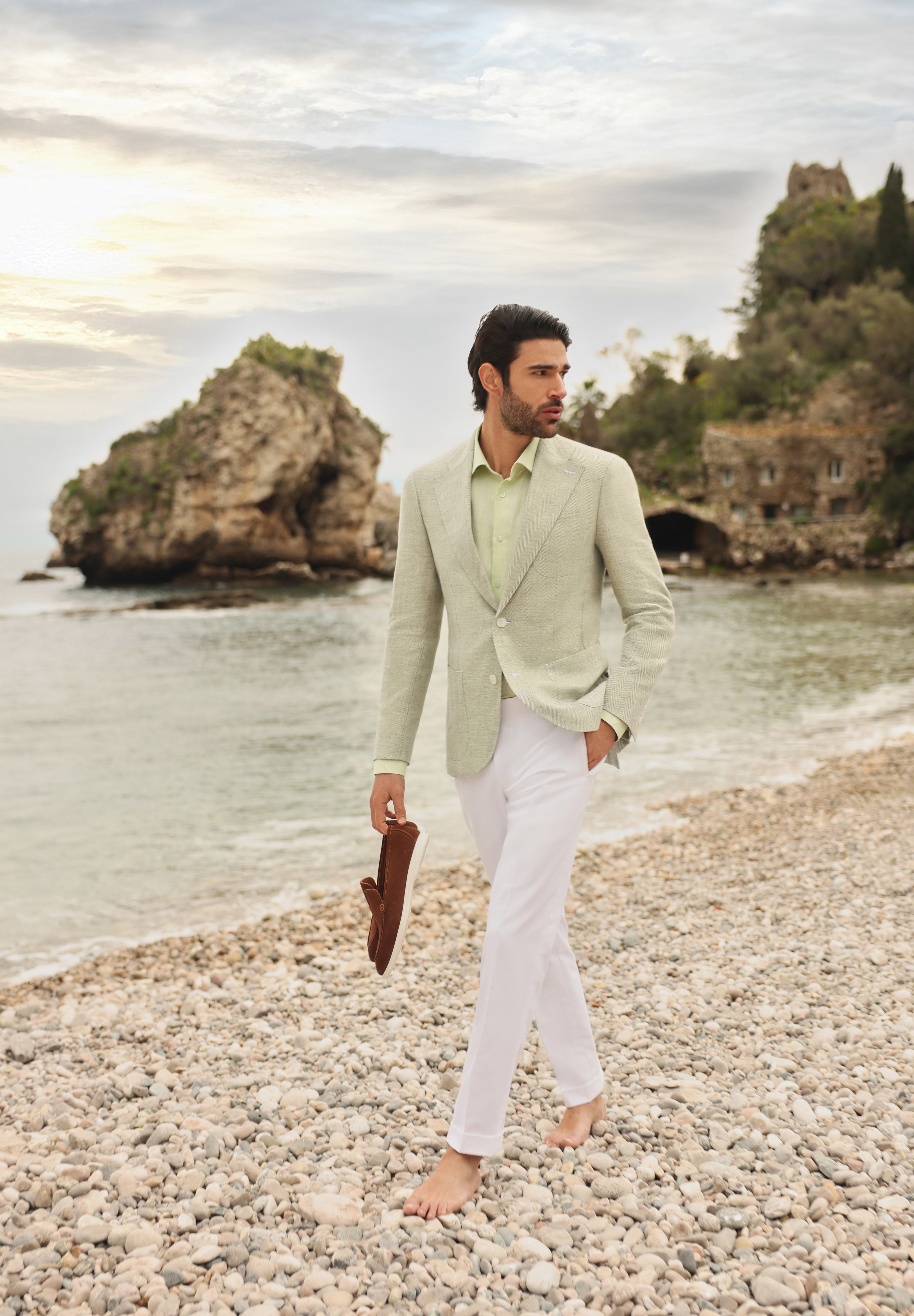 Inspirat de prospețimea brizelor marine și de texturile naturale ale coastei mediteraneene, acest sacou este realizat dintr-un blend rafinat de in și lână provenit de la renumita țesătorie italiană Drago.