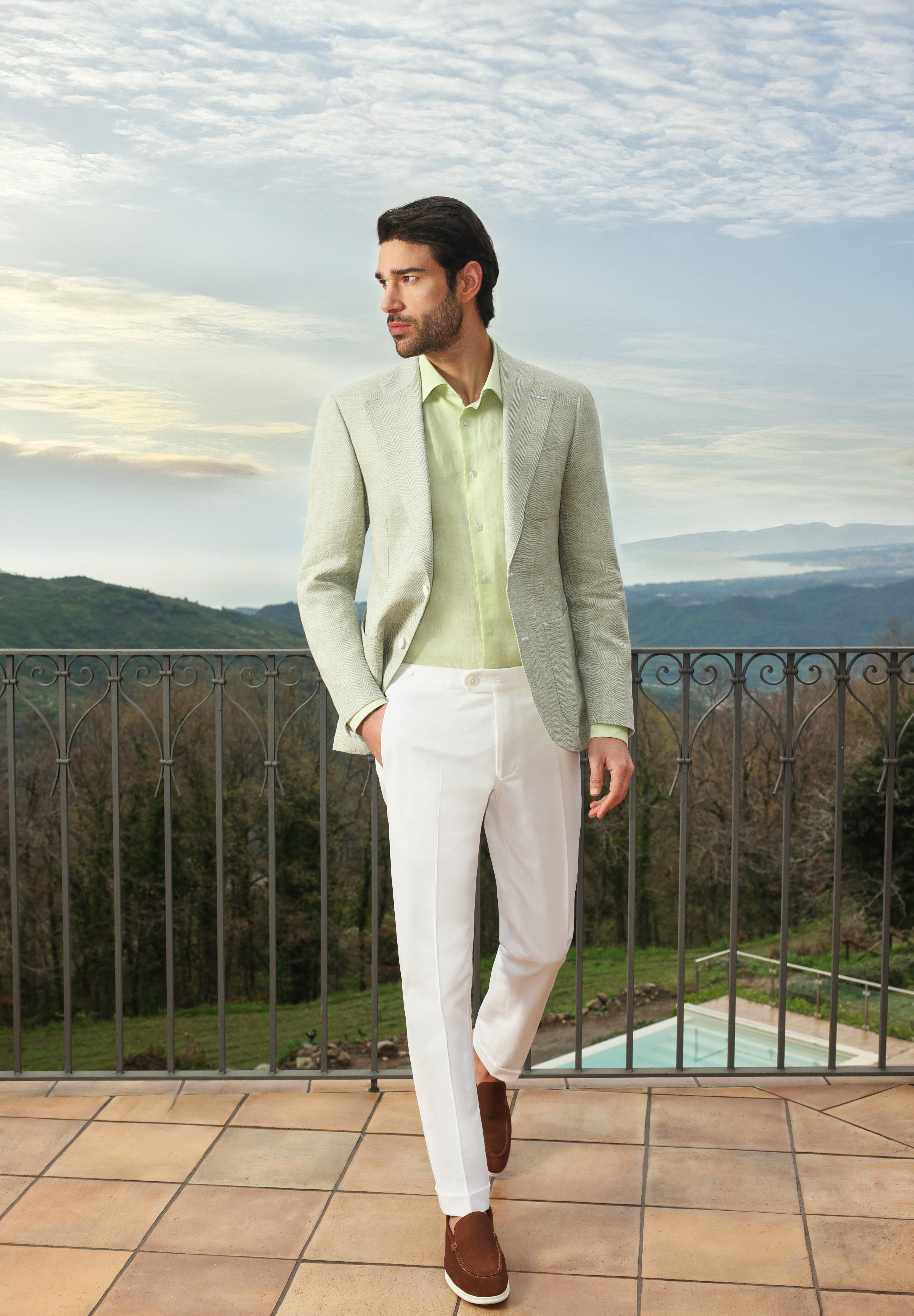 Sacoul Alcantara, realizat dintr-un blend fin de in și lână, te face să simți aerul nobil al relaxării italiene.