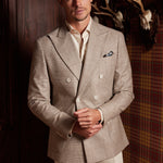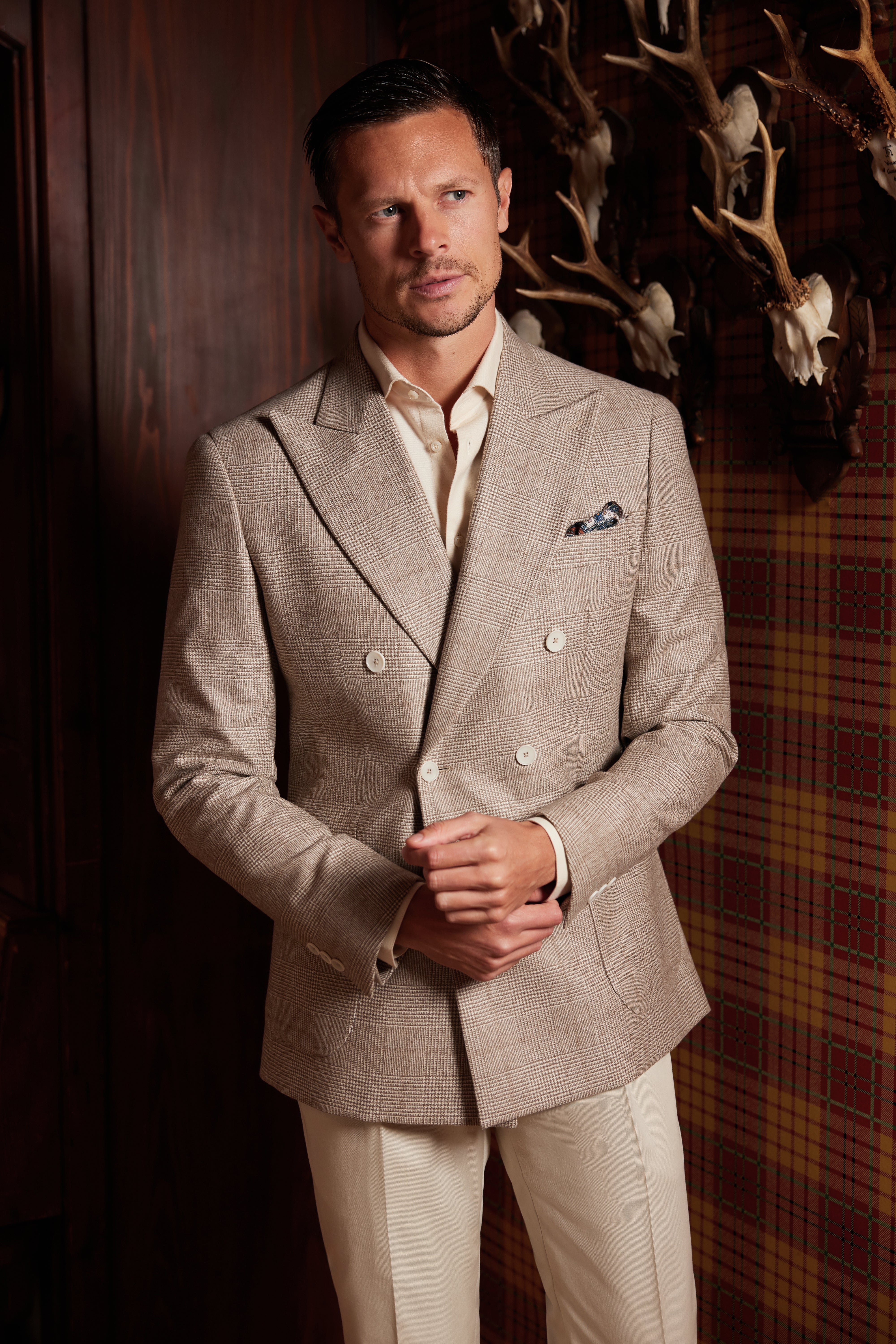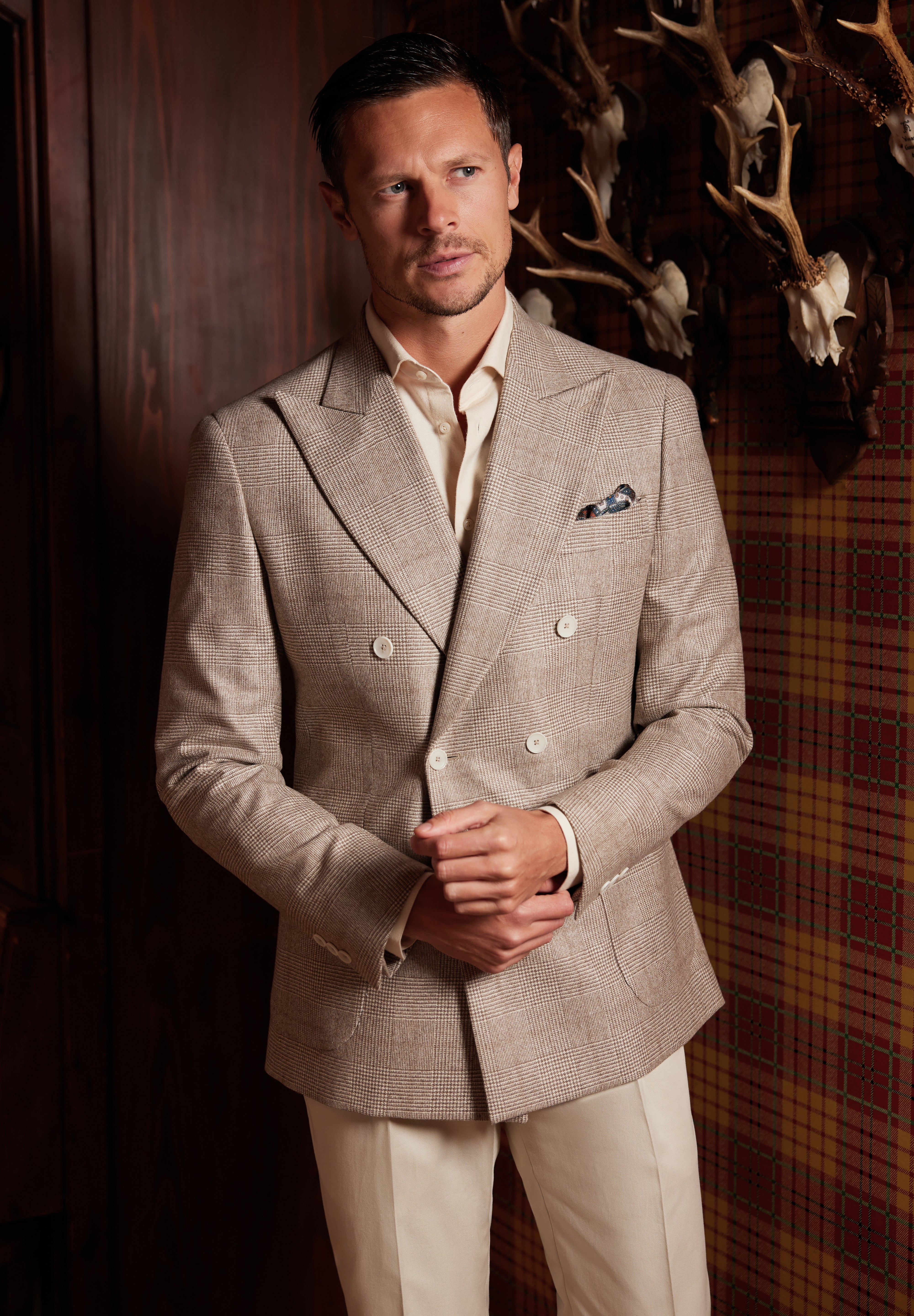 Die zweireihige Jacke aus 100 % reinem Loro Piana Kaschmir mit dezentem Karomuster vereint die Noblesse natürlicher Fasern mit der Wärme über ein Jahrhundert italienischer Tradition. Ihre feine, leicht samtige Textur verleiht ihr eine Eleganz, die die Jahreszeiten überdauert – spürbar beim Anfassen, aber auch durch den perfekten Sitz auf den Schultern.