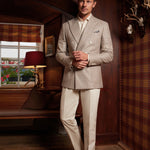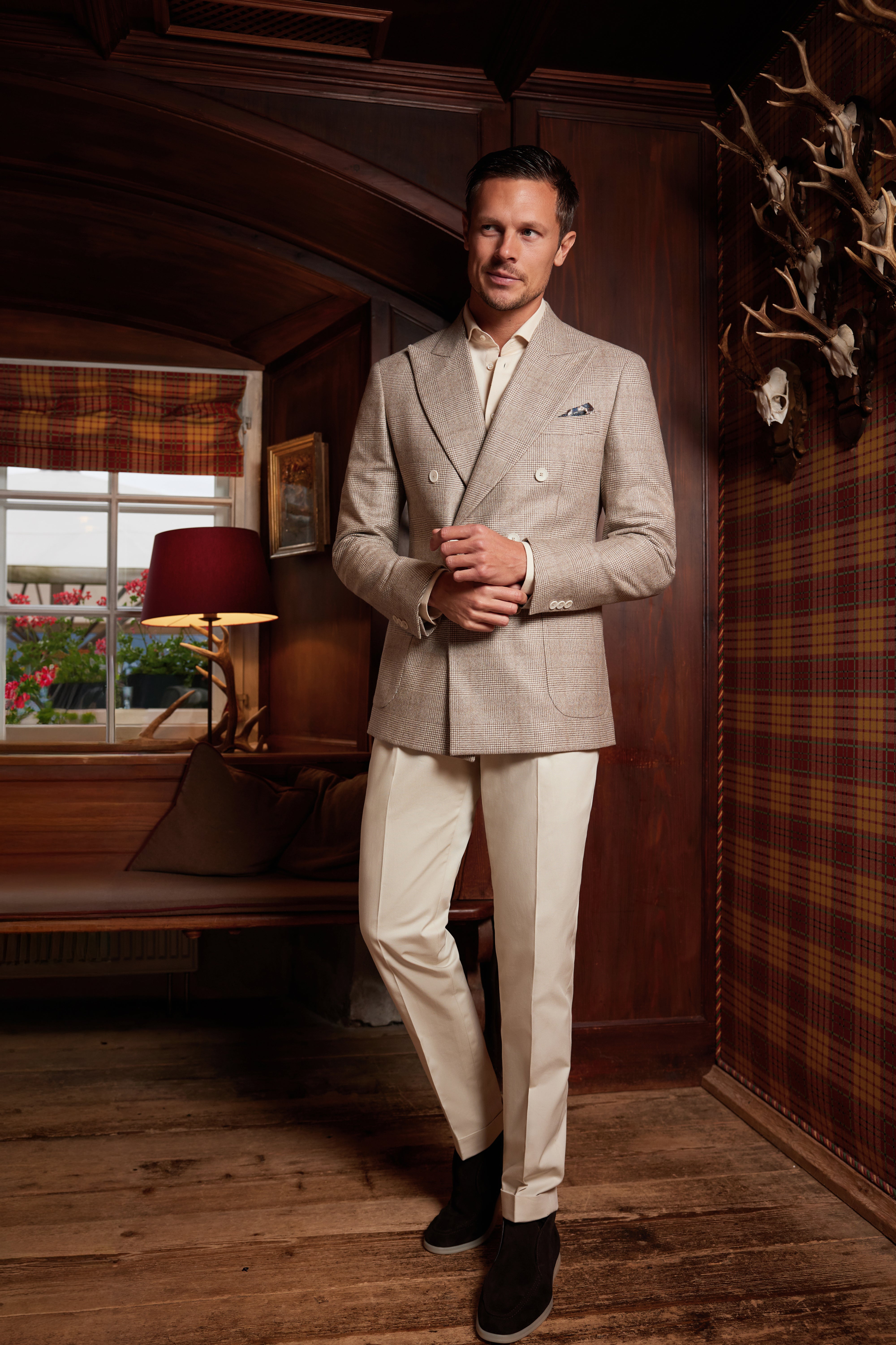 * Ergänzt wird diese wundervolle Jacke durch eine beige Chinohose aus extrafeiner Loro Piana Wolle , die das Ensemble mit einem Hauch mondäner Leichtigkeit vervollständigt.