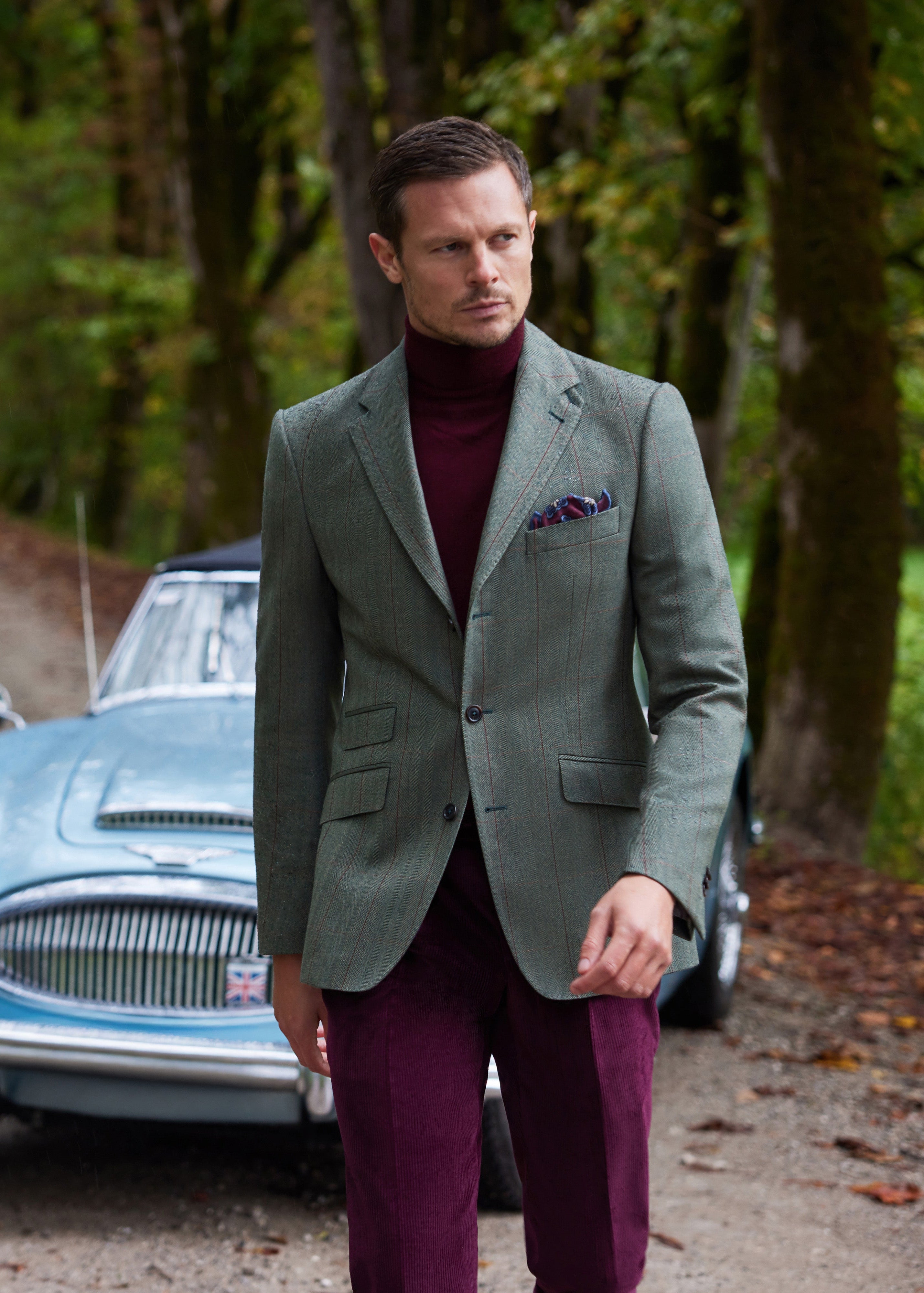 Der strukturierte, leicht verlängerte Schnitt mit breiten Revers und schrägen Taschen erinnert an die aristokratische Eleganz der Jäger vergangener Zeiten und passt perfekt zur urbanen Raffinesse.