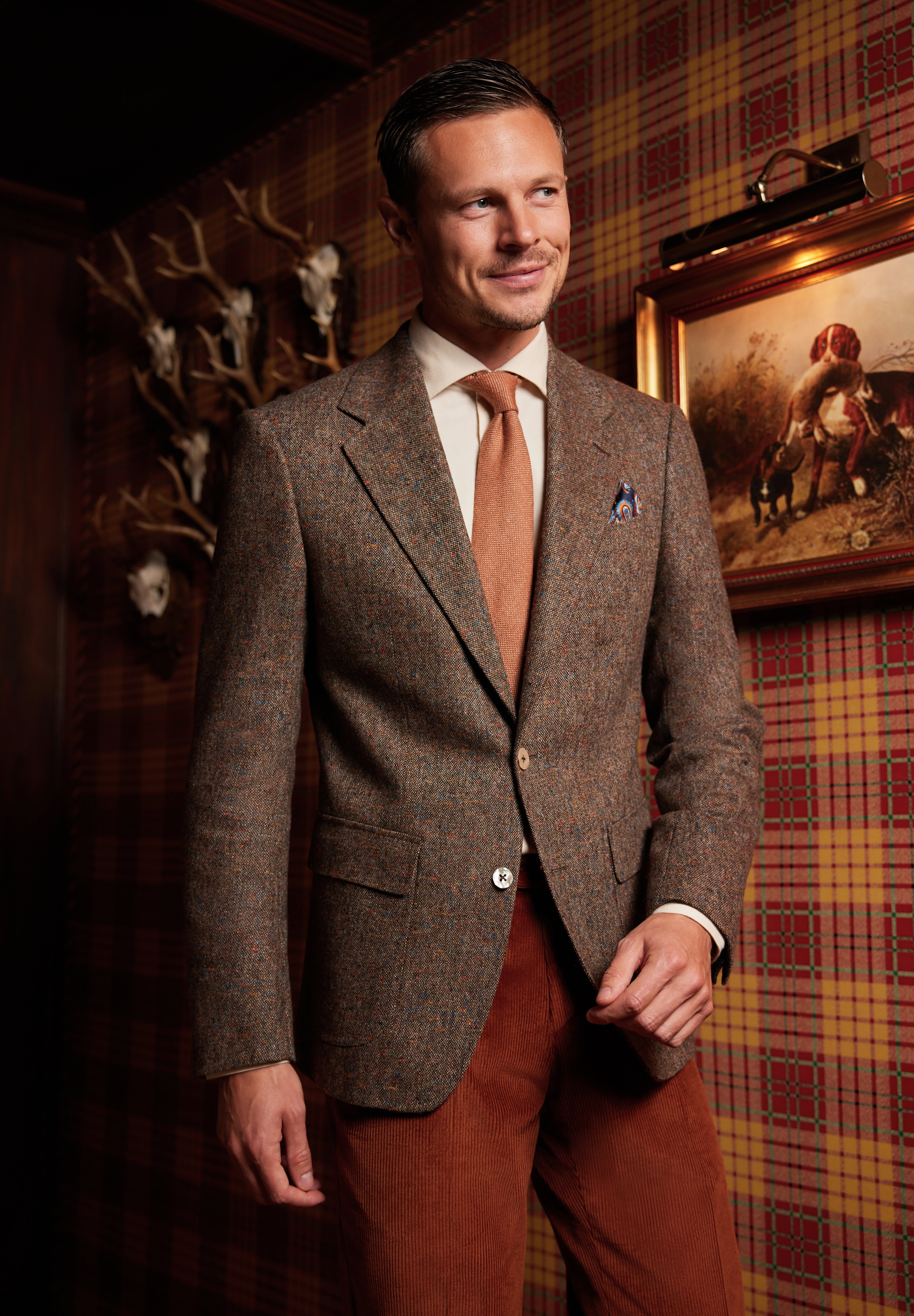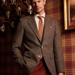 Die reiche Textur von 100 % Wolltweed , mit dezenten Farbeinsätzen, In den Farbtönen Kupfer, Erde und Waldgrün verleiht es einem klassischen Schnitt Tiefe und Wärme. Ein authentisches Stück, geboren aus den rauen Landschaften Irlands und angepasst an den raffinierten Rhythmus des modernen Lebens.