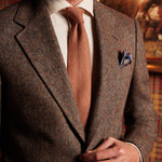 Die strukturierte Krawatte und das Einstecktuch mit feinen Akzenten verleihen einen Hauch von Tiefe und betonen die Liebe zum Detail, die das Tudor Tailor- Universum ausmacht.