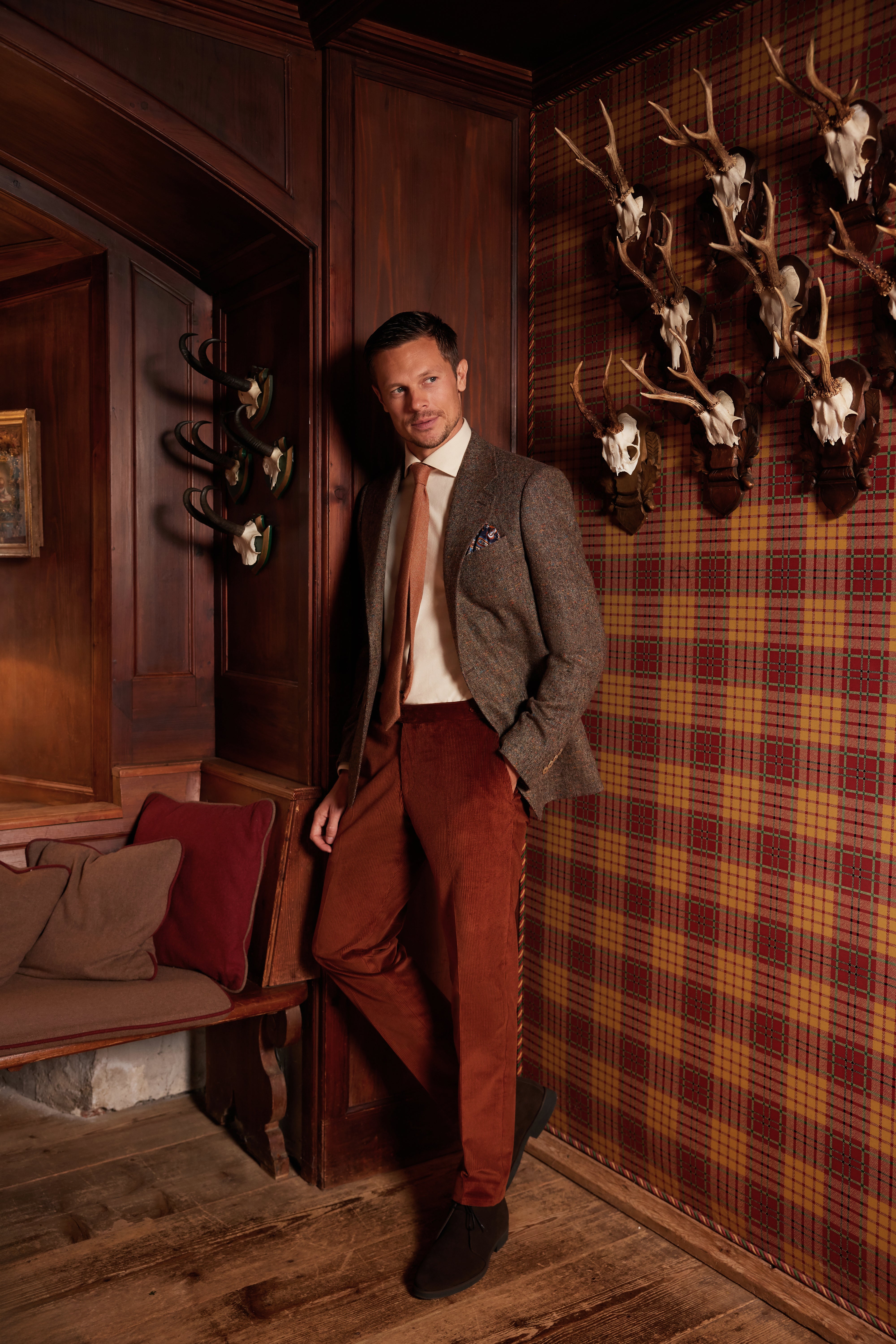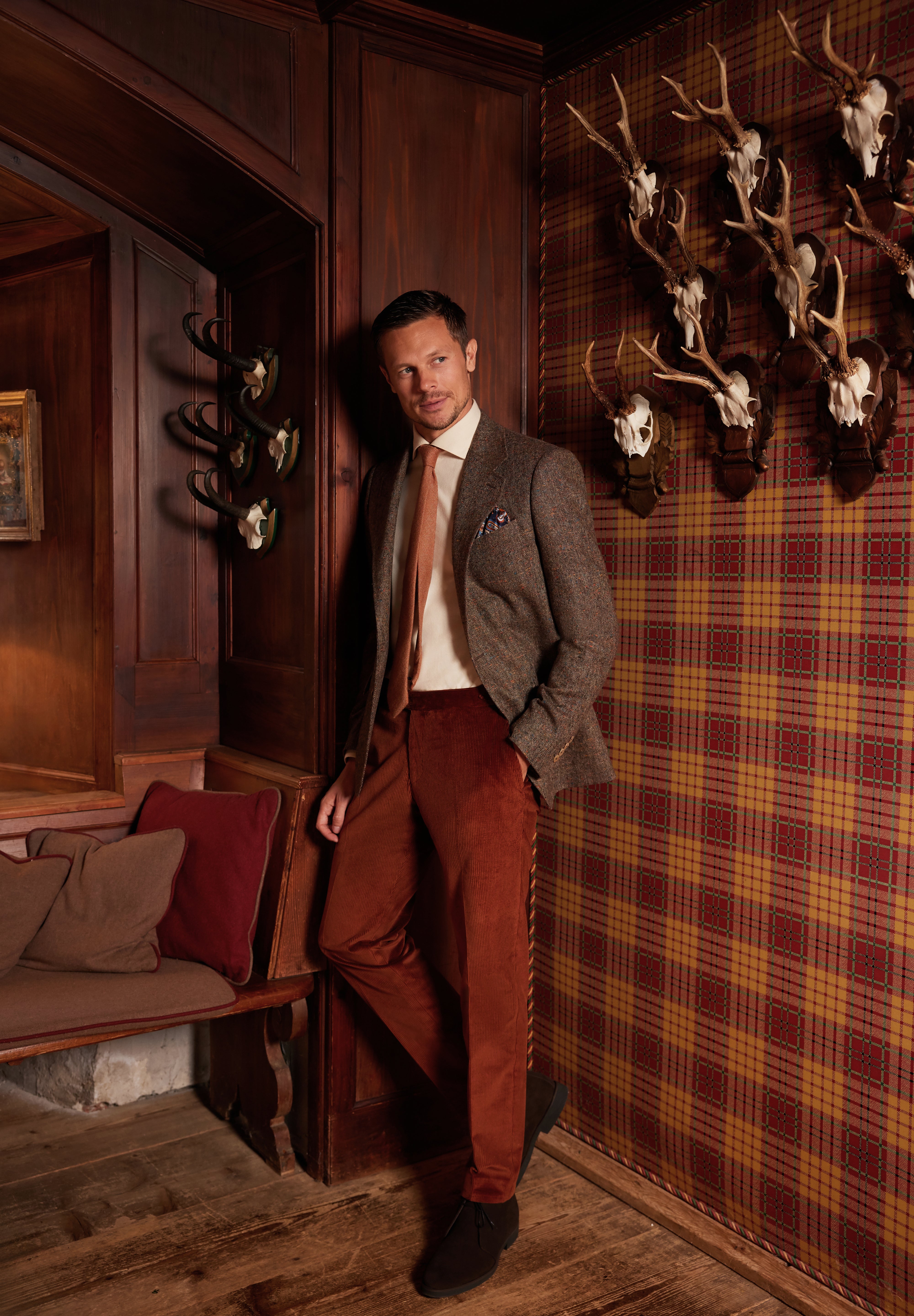 * Die edle Cordhose aus der berühmten Weberei Duca Visconti in einem warmen Zimtton rundet das Ensemble mit einem Hauch von mondänem Komfort ab und spiegelt die Idee von Luxus wider, der gelebt und nicht nur getragen wird.