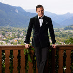 Seine reiche Textur mit subtilem Glanz fängt das Licht auf unmerkliche Weise ein und ändert bei Bewegung den Farbton. Der Stoff – ein exquisiter Dormeuil-Samt – bietet eine makellose Struktur und eine Haptik, die von zeitloser Eleganz zeugt.