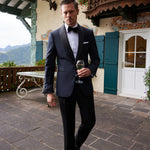Dieser dunkelblaue Smoking aus feiner Loro Piana Super 150- Wolle fängt das Licht dank seiner fließenden Textur und der Feinheit der Naturfaser auf subtile, fast flüssige Weise ein.